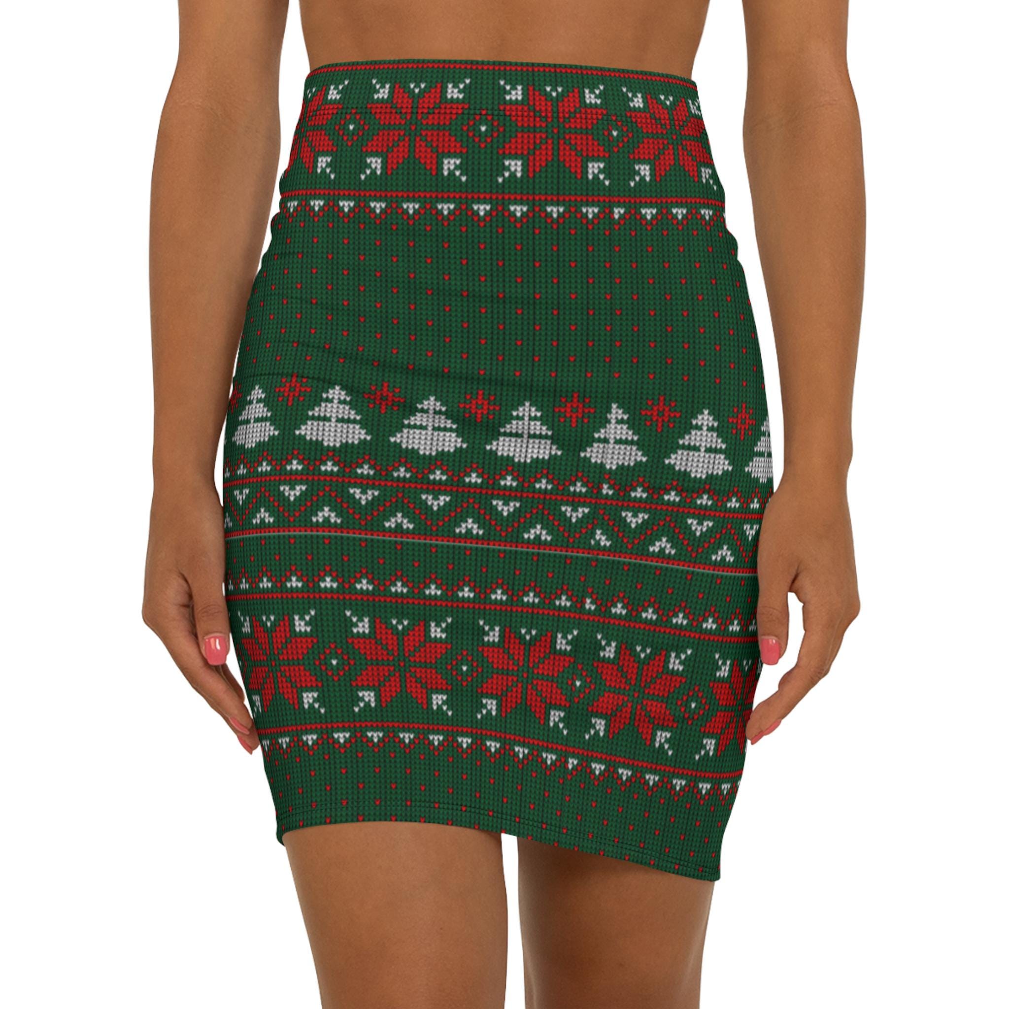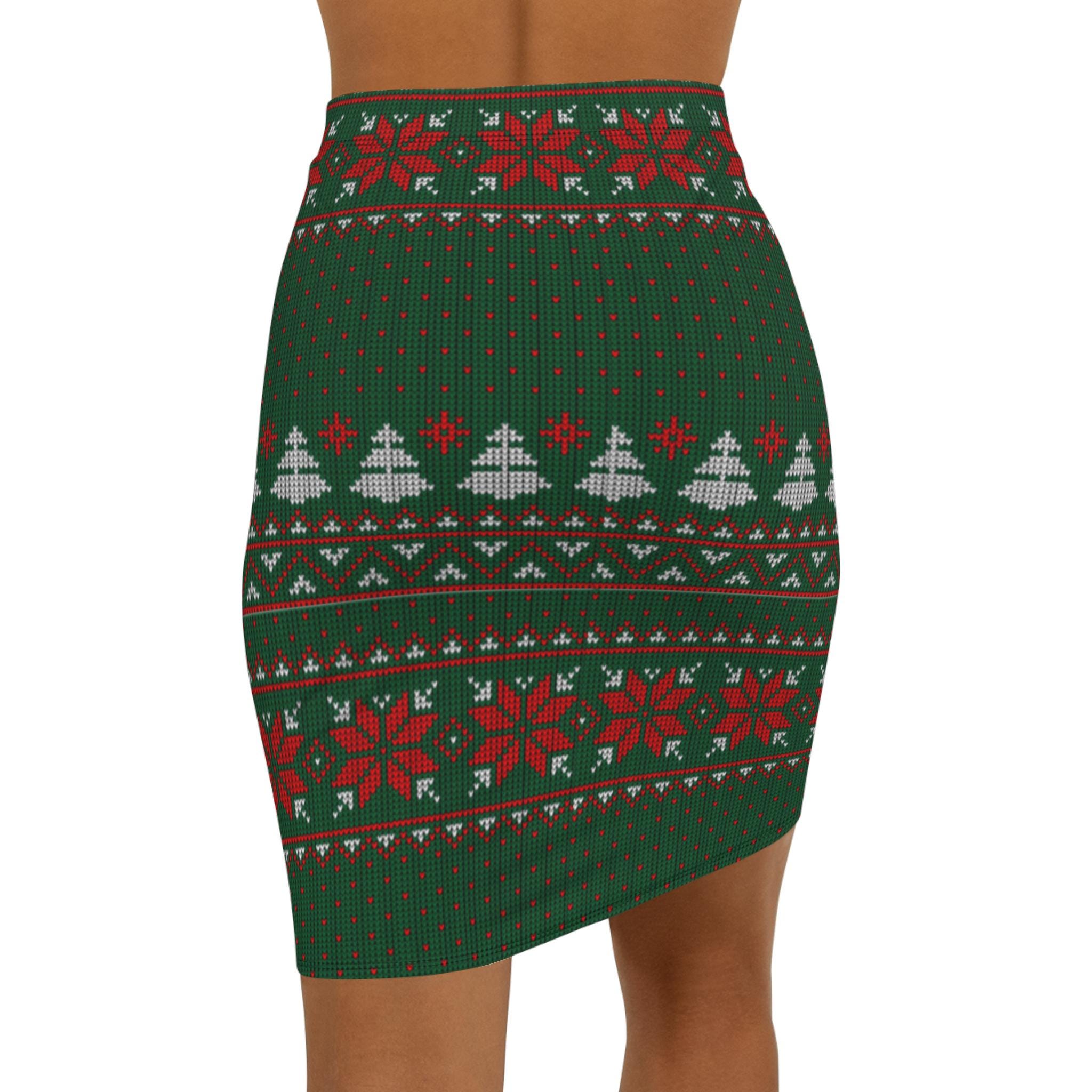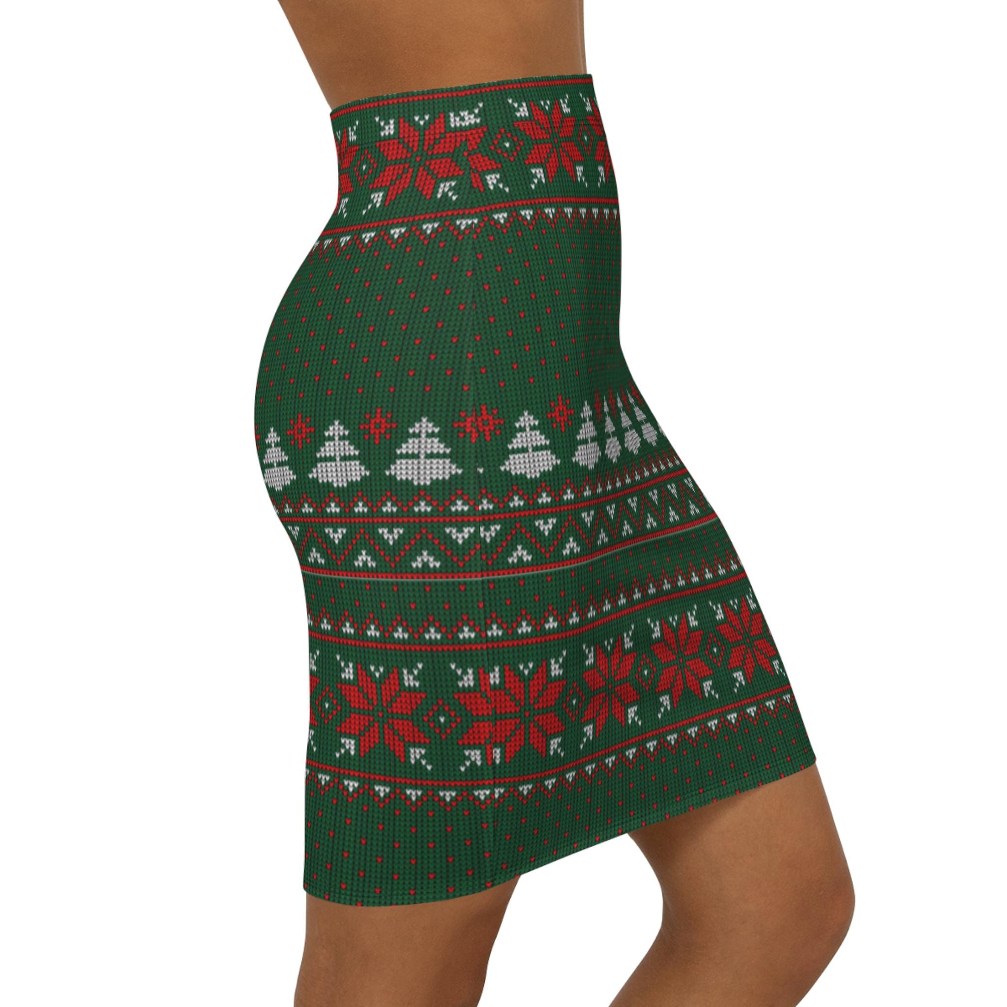 Wrap yourself in holiday cheer with this mid-waist pencil skirt featuring a cozy, Nordic-inspired pattern. Deep evergreen sets the stage for rows of stylized poinsettias and fir silhouettes in warm reds and soft whites — a nod to knitted winter sweaters translated into stretchy, wearable fabric. The slim, mid-rise cut flatters the waist and hips while the elastic waistband keeps the fit comfortable through long nights of mingling. Wear it with chunky knits, a fitted turtleneck, or layered under a wool coat to bring a subtle, festive energy to seasonal gatherings and winter outings. The all-over print keeps the pattern continuous and lively, while the four-way stretch moves with you — whether you’re navigating holiday markets, candlelit dinners, or cozy movie nights at home.
