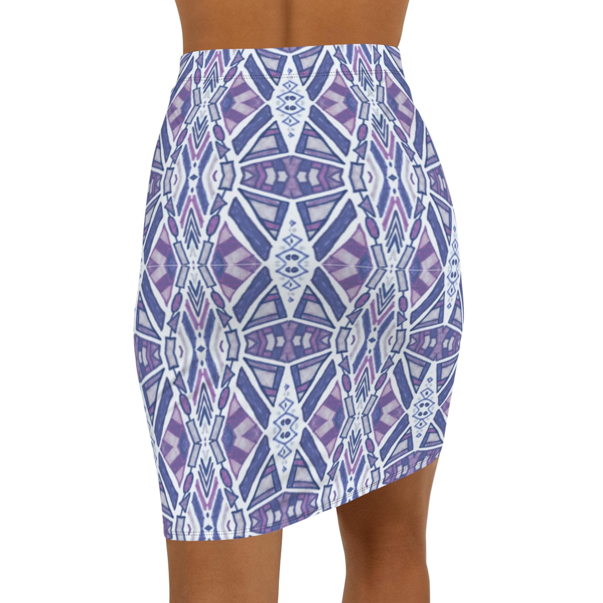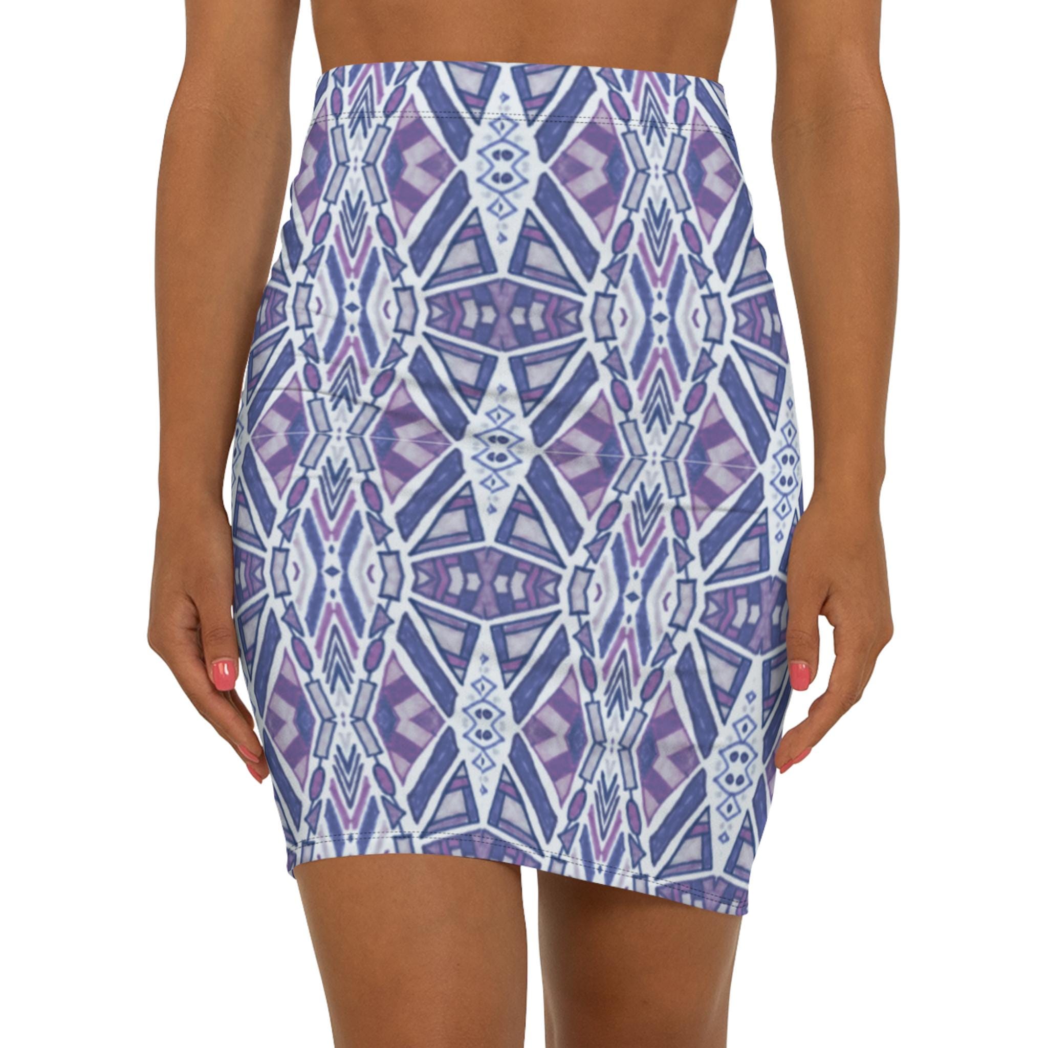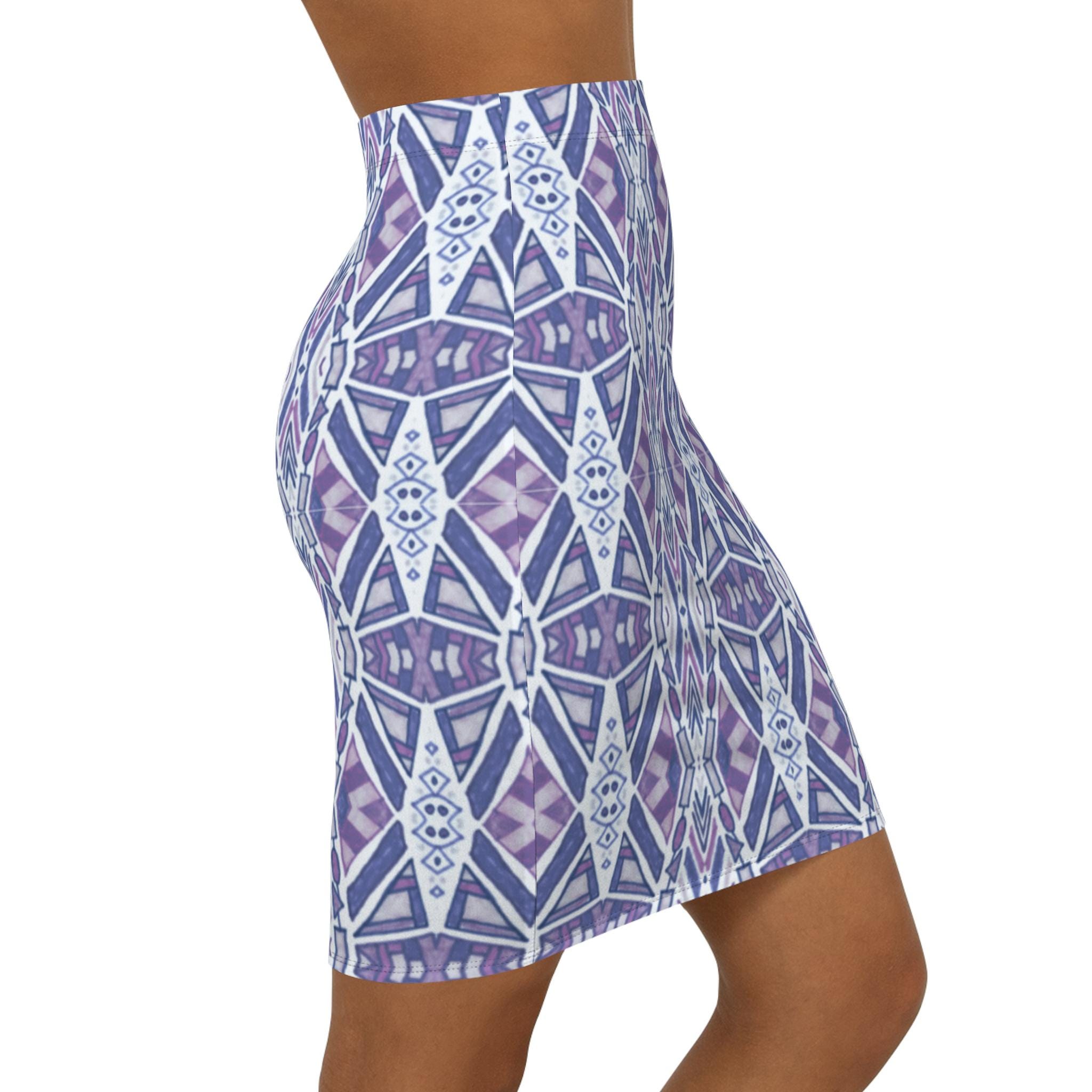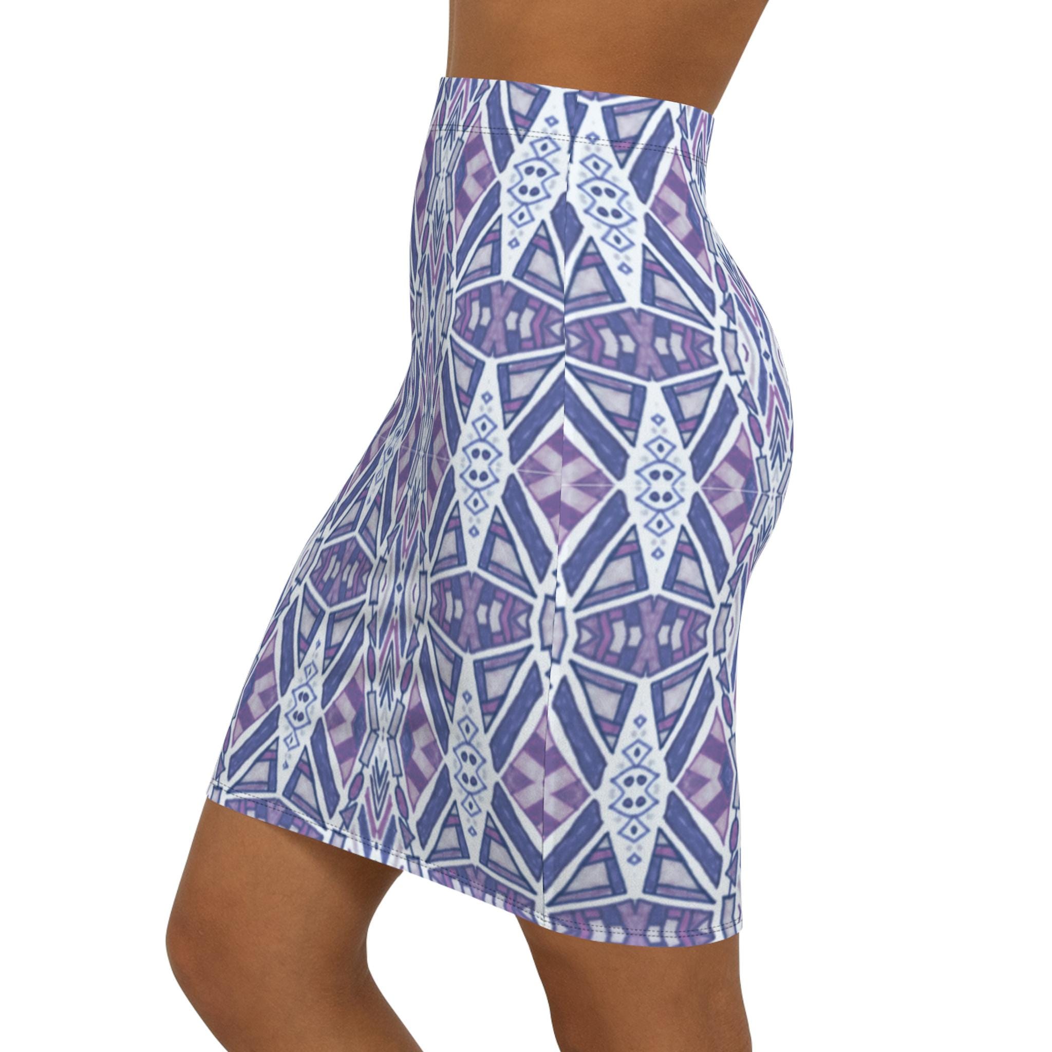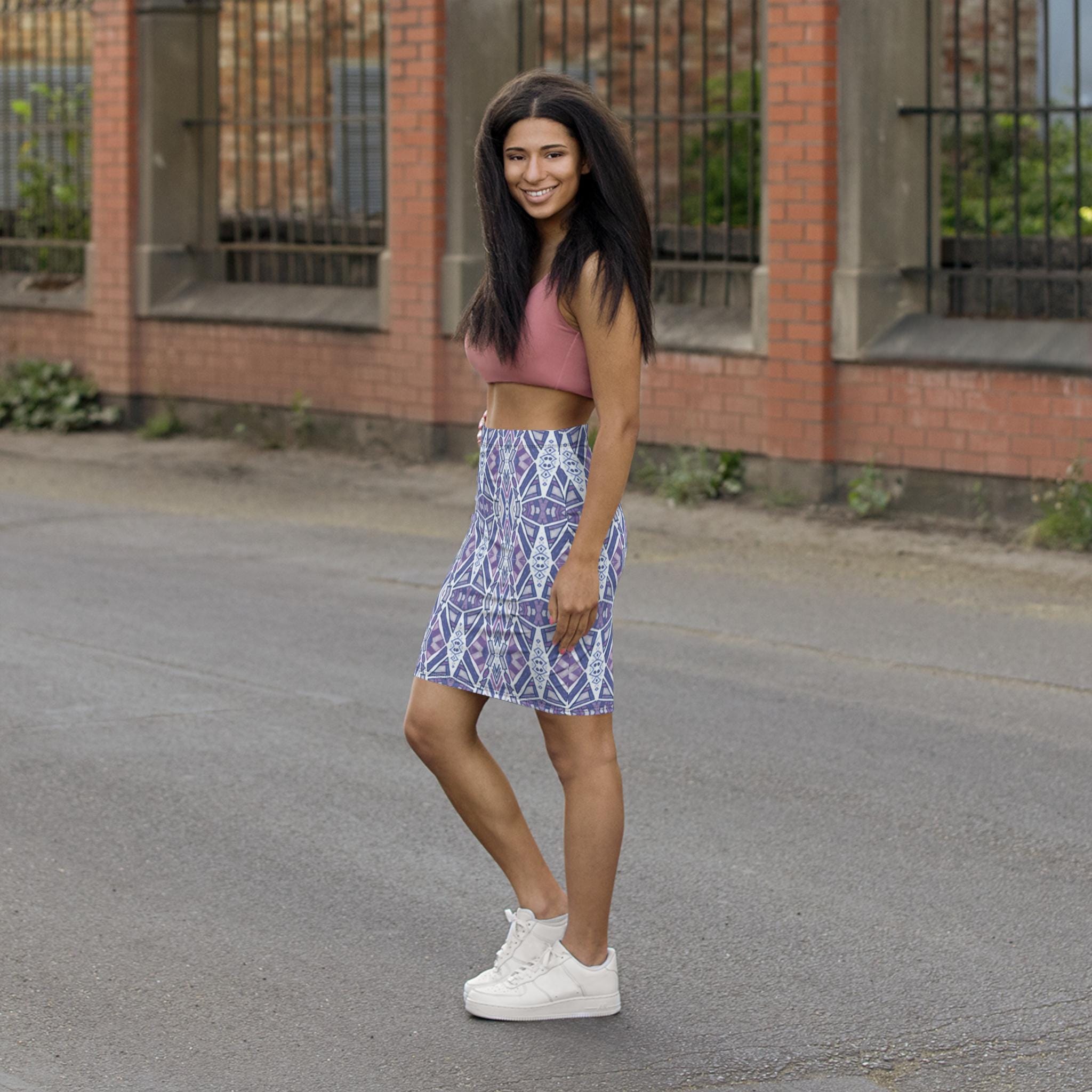 Slip into a skirt that feels like a soft, confident whisper. This mid-waist pencil skirt wraps the hips in a close, stretchy silhouette while a kaleidoscope of lavender, indigo, and soft white motifs moves with you. The print reads like hand-dyed textiles seen in coastal markets — slightly organic, quietly bold — so it pairs easily with a tucked linen shirt for daytime errands or a silk cami for a night out. The elastic waistband and four-way stretch mean you can sit, step, and sway without fuss. Wear it when you want an outfit that’s simultaneously composed and playful — a go-to piece for gallery openings, weekend brunches, or a low-key date night that still feels intentional.
