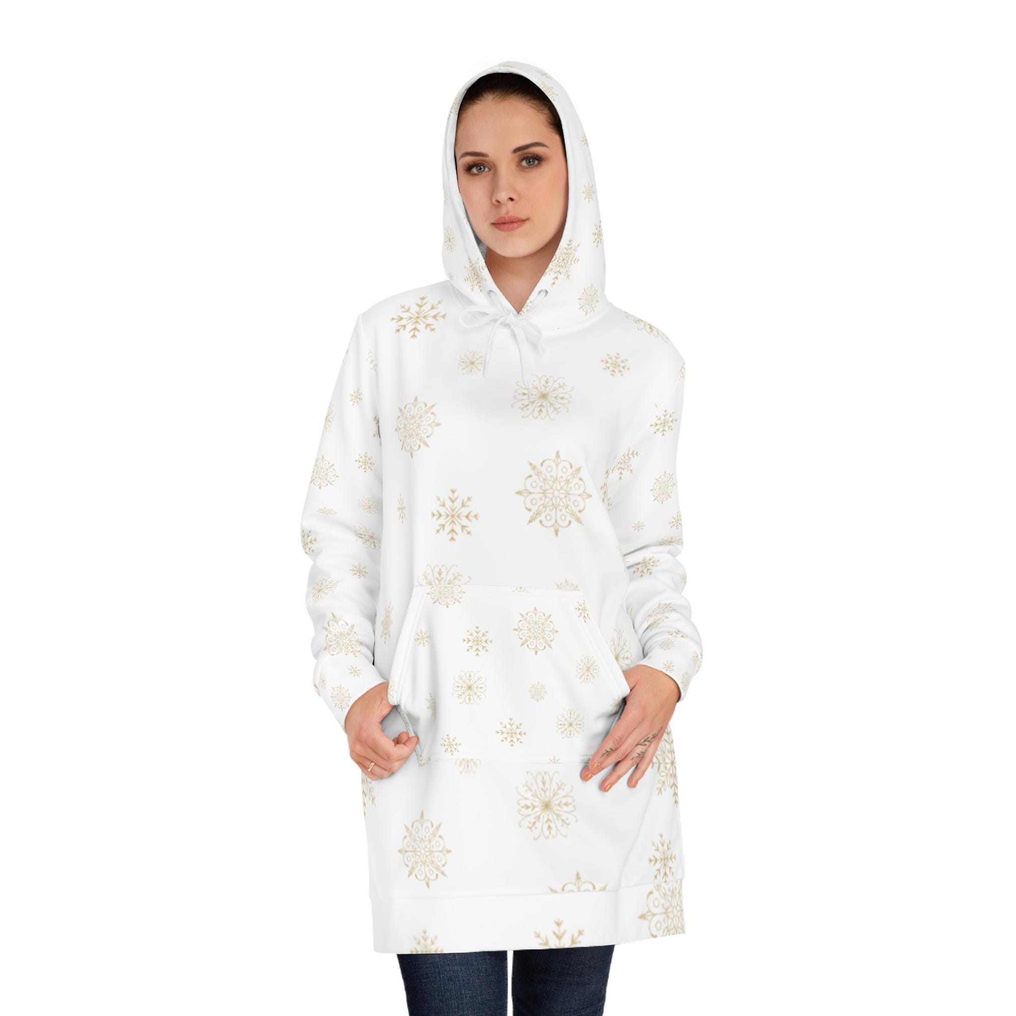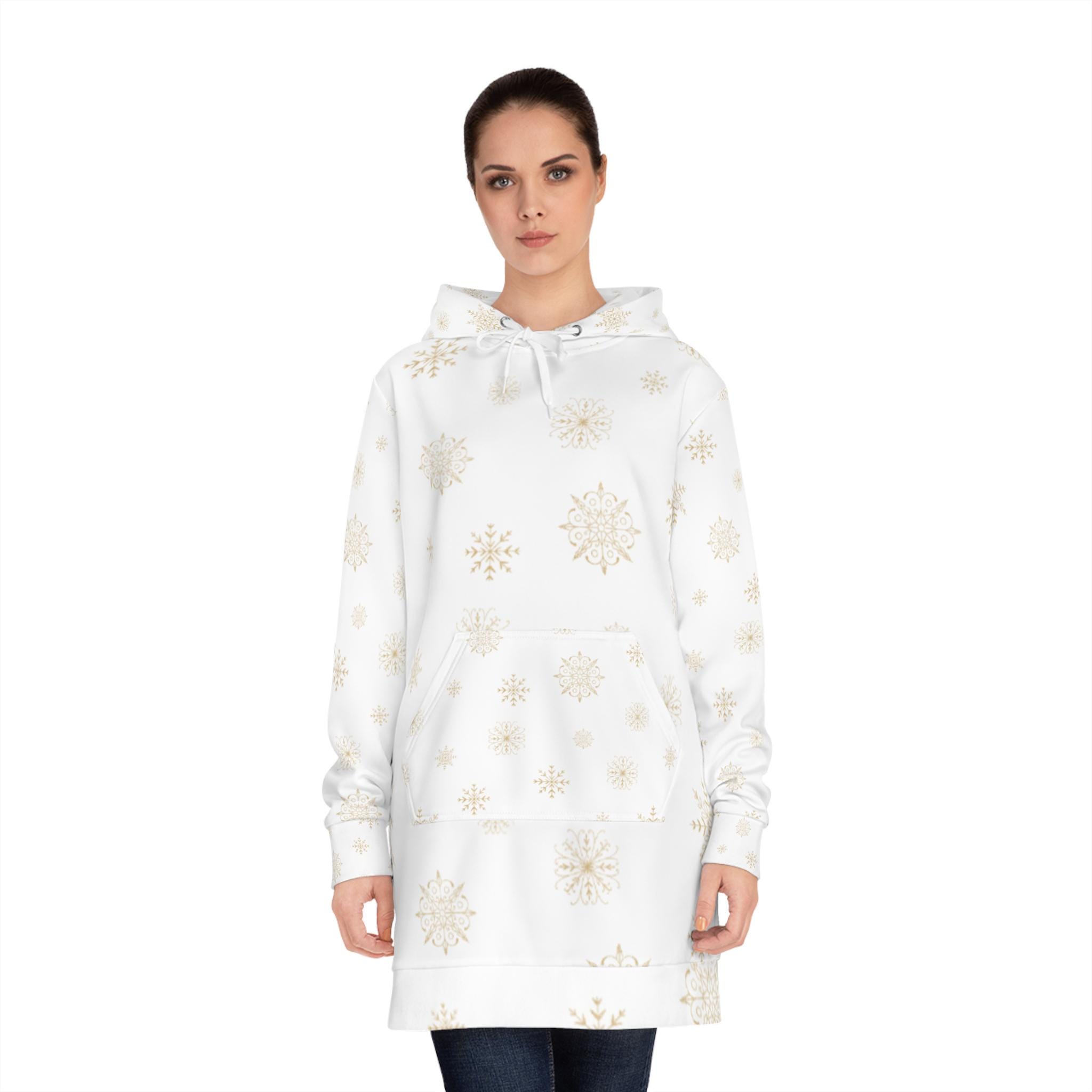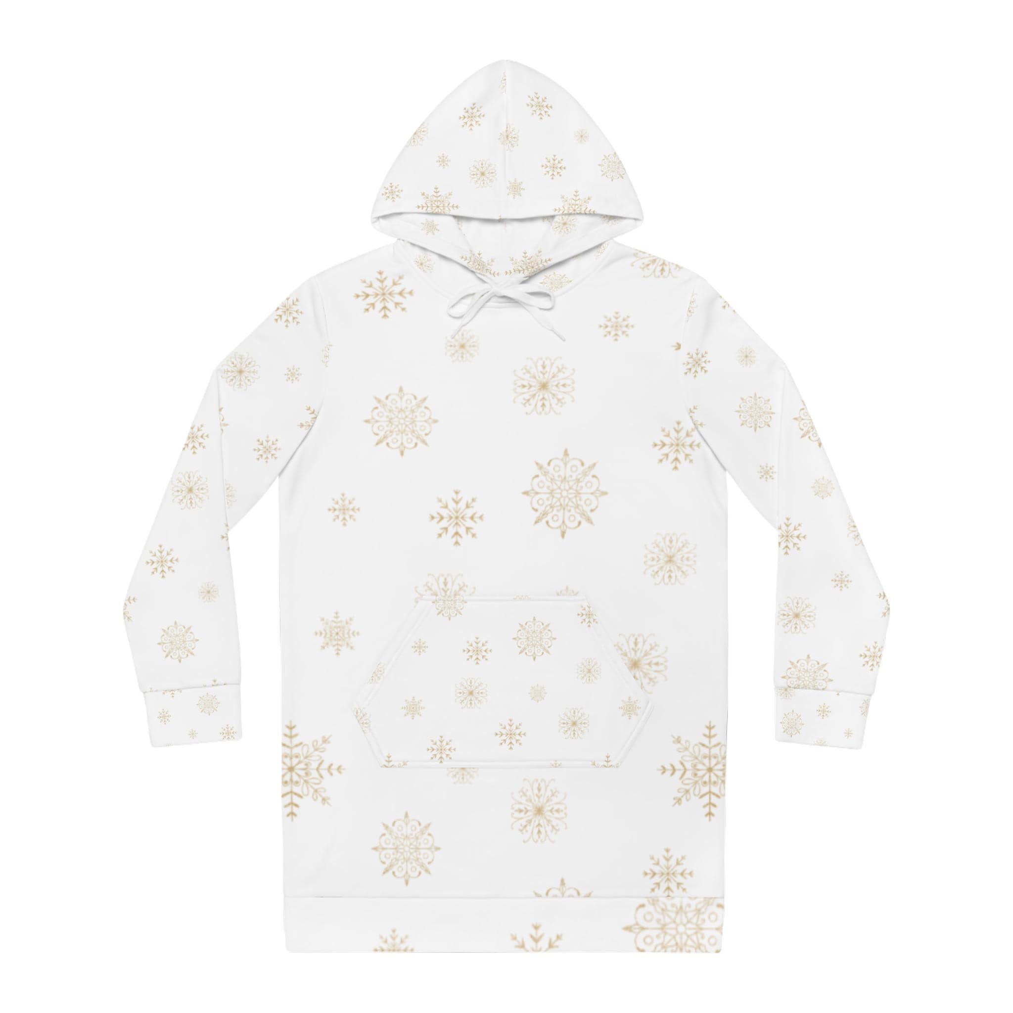 Light, cozy, and quietly festive — this hoodie dress wraps you in a soft white canvas patterned with delicate, warm-beige snowflakes. It’s roomy enough to move in, with a kangaroo pocket for tucked hands and small essentials, and a hood with an adjustable drawstring for added shelter on chilly walks. The all-over print keeps the design seamless from hood to hem, while the slightly shiny, medium-weight polyester holds shape and dries fast after a damp day outside. Wear it layered with tights and boots for a slow morning of errands, or pull it on after a brisk walk and linger with a warm drink. The subtle snowflake motif brings a calm, seasonal mood without shouting — a quiet winter piece you’ll reach for when you want comfort with a hint of charm.