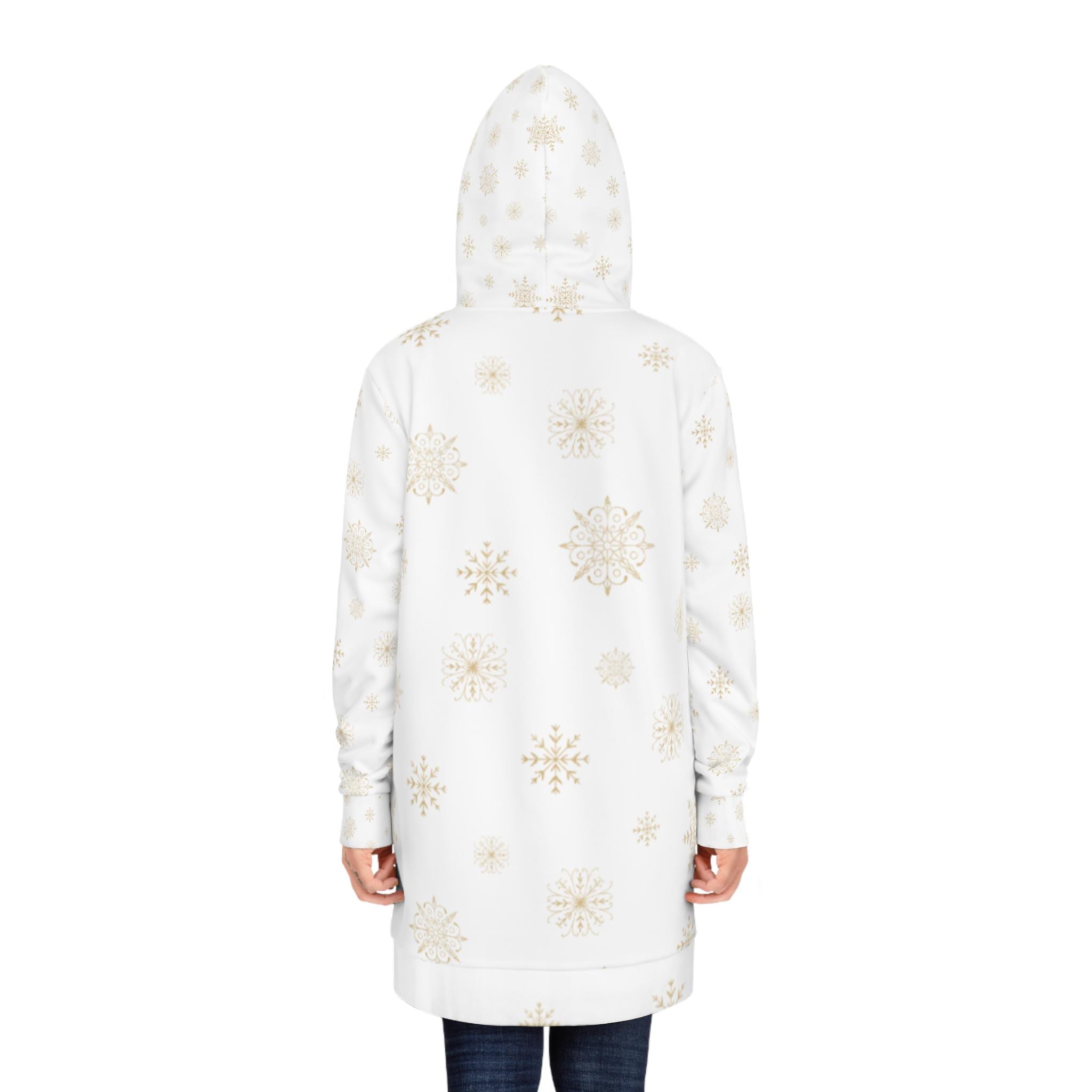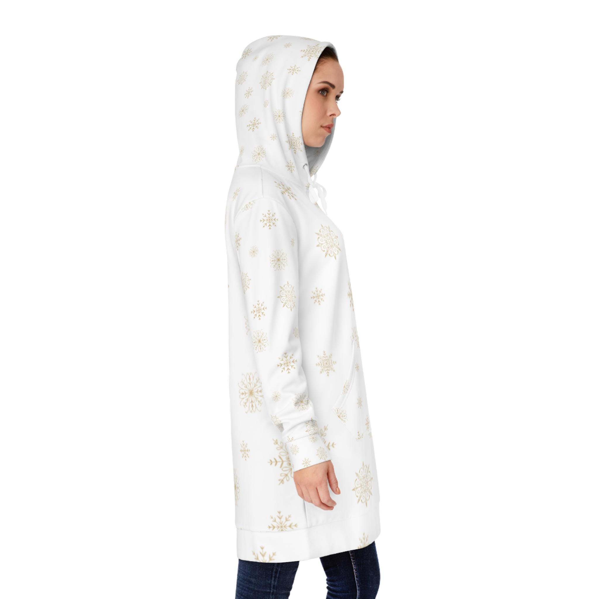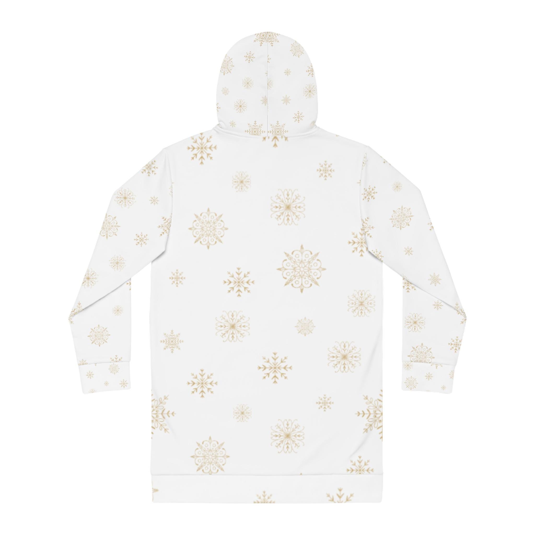 Light, cozy, and quietly festive — this hoodie dress wraps you in a soft white canvas patterned with delicate, warm-beige snowflakes. It’s roomy enough to move in, with a kangaroo pocket for tucked hands and small essentials, and a hood with an adjustable drawstring for added shelter on chilly walks. The all-over print keeps the design seamless from hood to hem, while the slightly shiny, medium-weight polyester holds shape and dries fast after a damp day outside. Wear it layered with tights and boots for a slow morning of errands, or pull it on after a brisk walk and linger with a warm drink. The subtle snowflake motif brings a calm, seasonal mood without shouting — a quiet winter piece you’ll reach for when you want comfort with a hint of charm.
