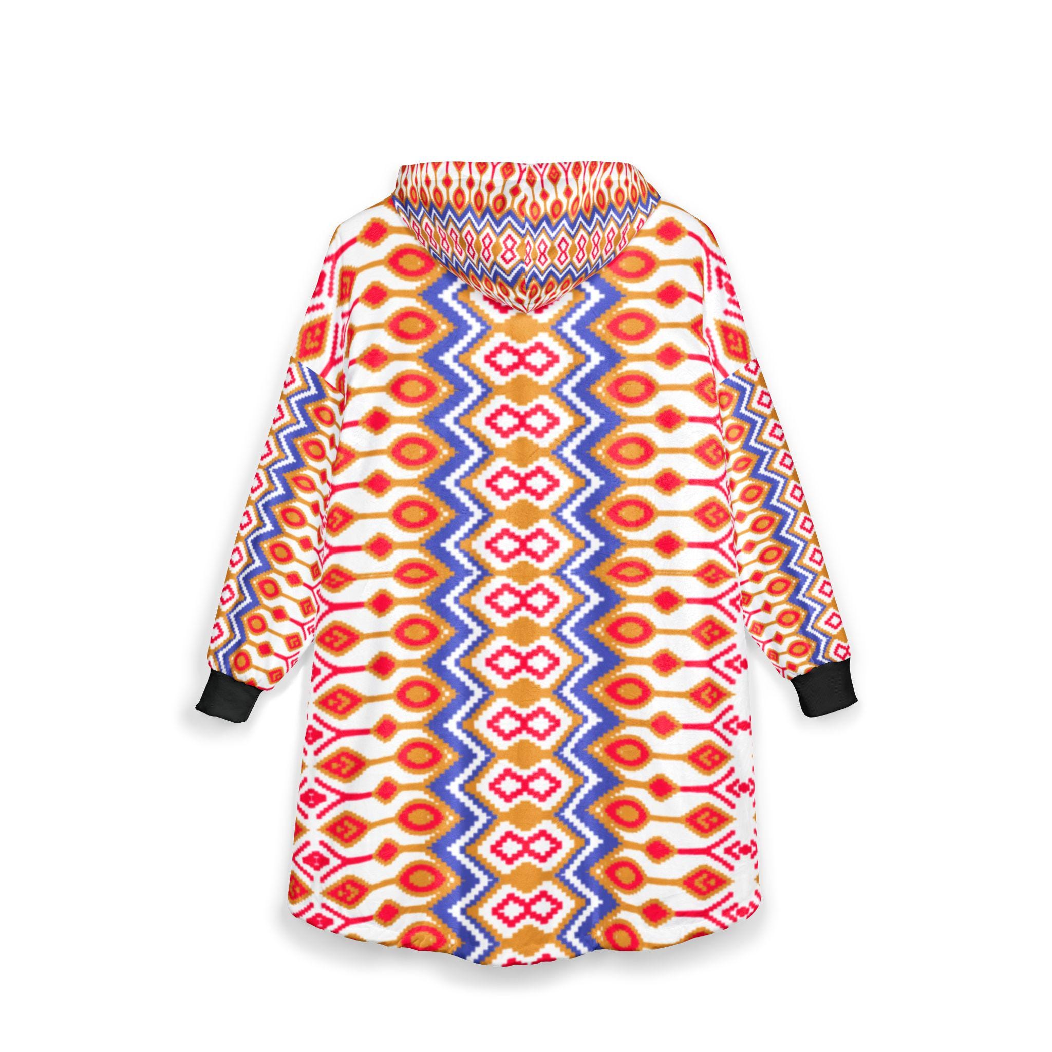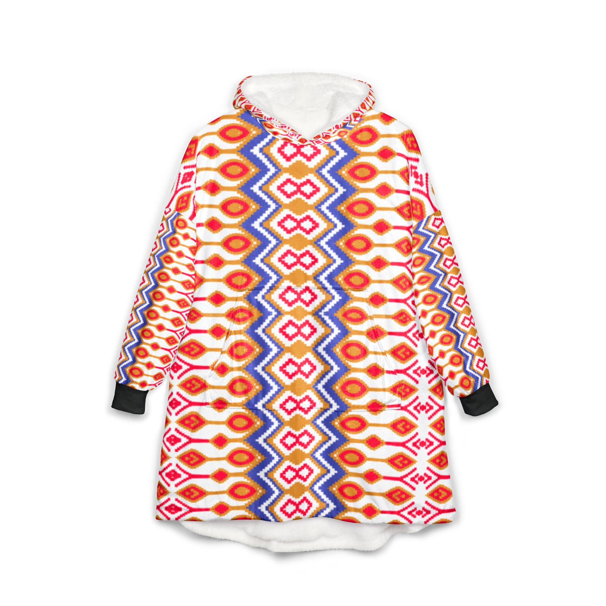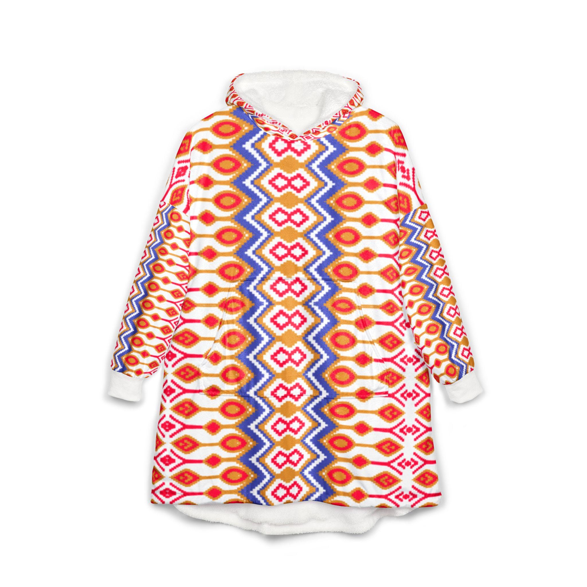 Wrap yourself in a warm, wearable hug with this cozy hooded blanket. Bright, rhythmic patterns of coral, gold, and cobalt ripple across soft polyester fleece, bringing a playful, handwoven vibe to quiet mornings and late-night movie marathons. The oversized hood and roomy kangaroo pocket hold chilled hands or a hot mug, while the lightweight medium-weight fabric keeps you comfortably warm without feeling bulky. Whether you’re lounging on the couch, reading by a window, or stepping out to grab a snack, the bold geometric print adds a cheerful, artisanal touch to everyday downtime.
