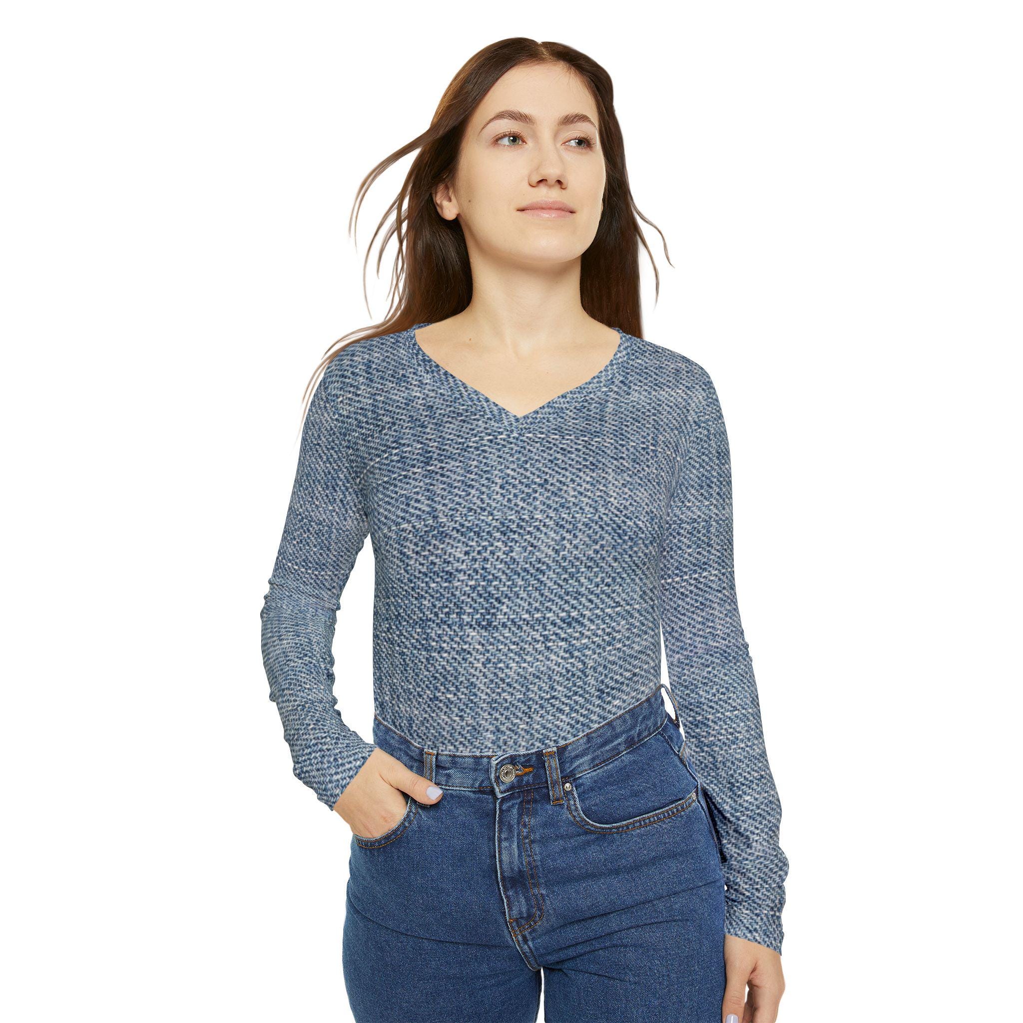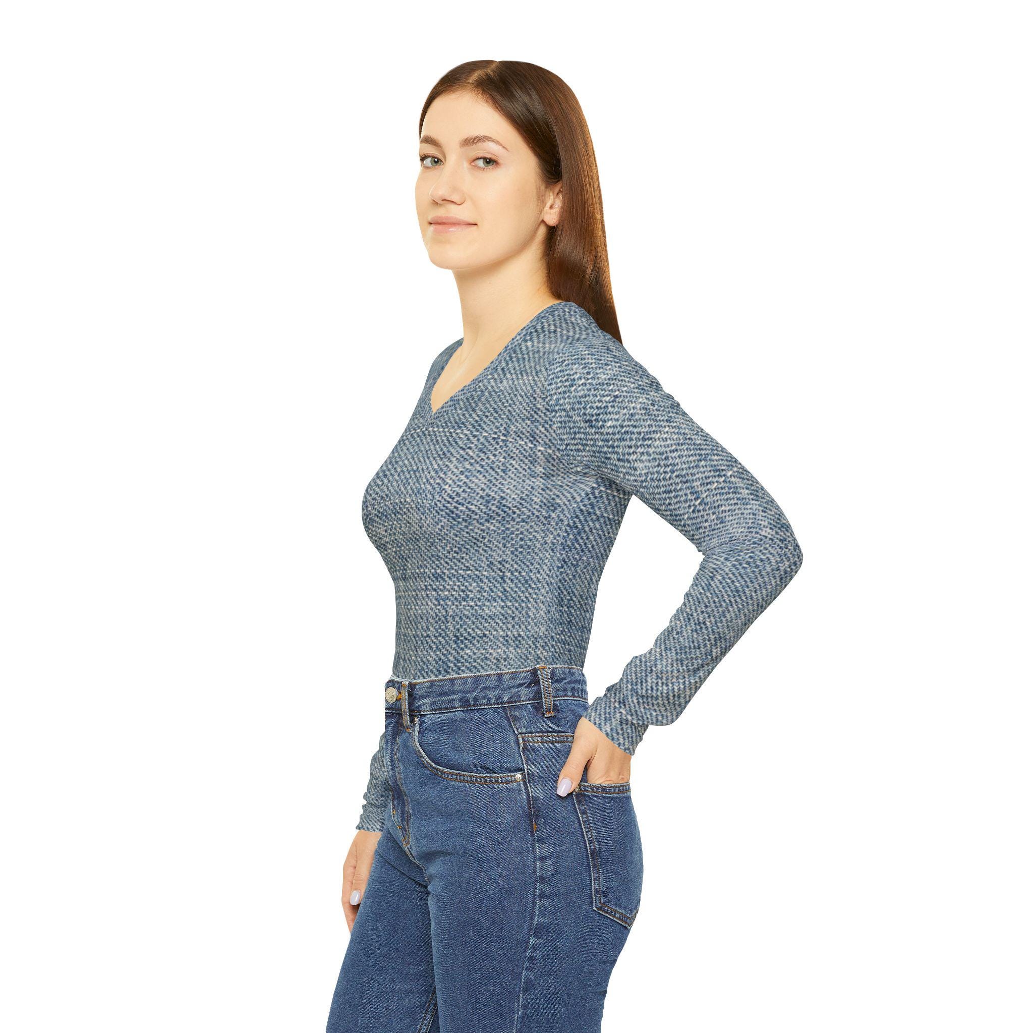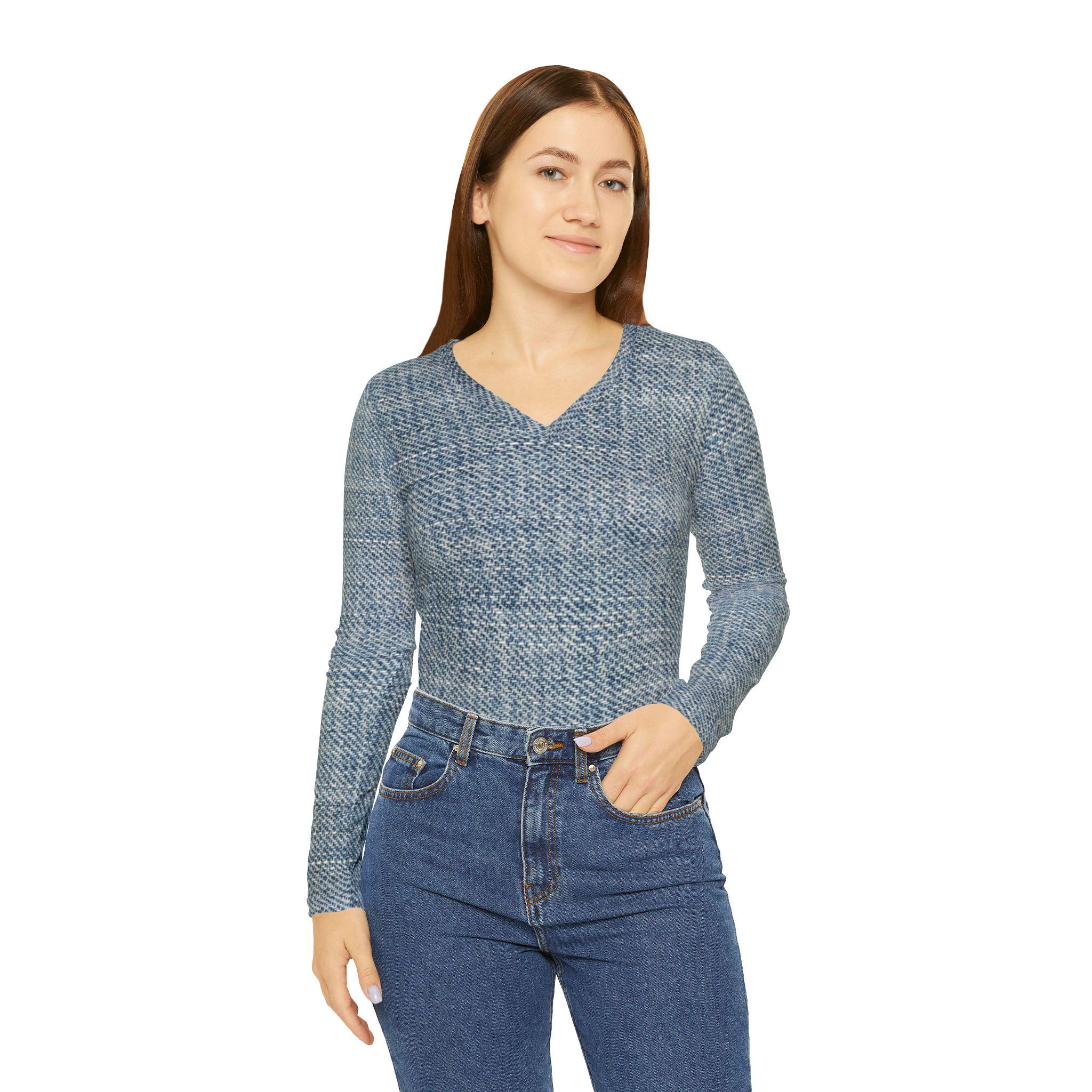 A breezy, lived-in long sleeve V-neck that feels like a familiar favorite from the first wear. The subtle blue woven texture reads like faded denim or washed linen — calm, muted, and easy to layer. Lightweight and stretchy, it moves with you whether you’re running errands, sitting with a book at a café, or layering under a cardigan for a cool morning walk. The clean V neckline and simple silhouette keep the look relaxed and quietly chic. Because the fabric is soft and drapey, it settles comfortably against the body without clinging, inviting casual confidence every time you reach for it.