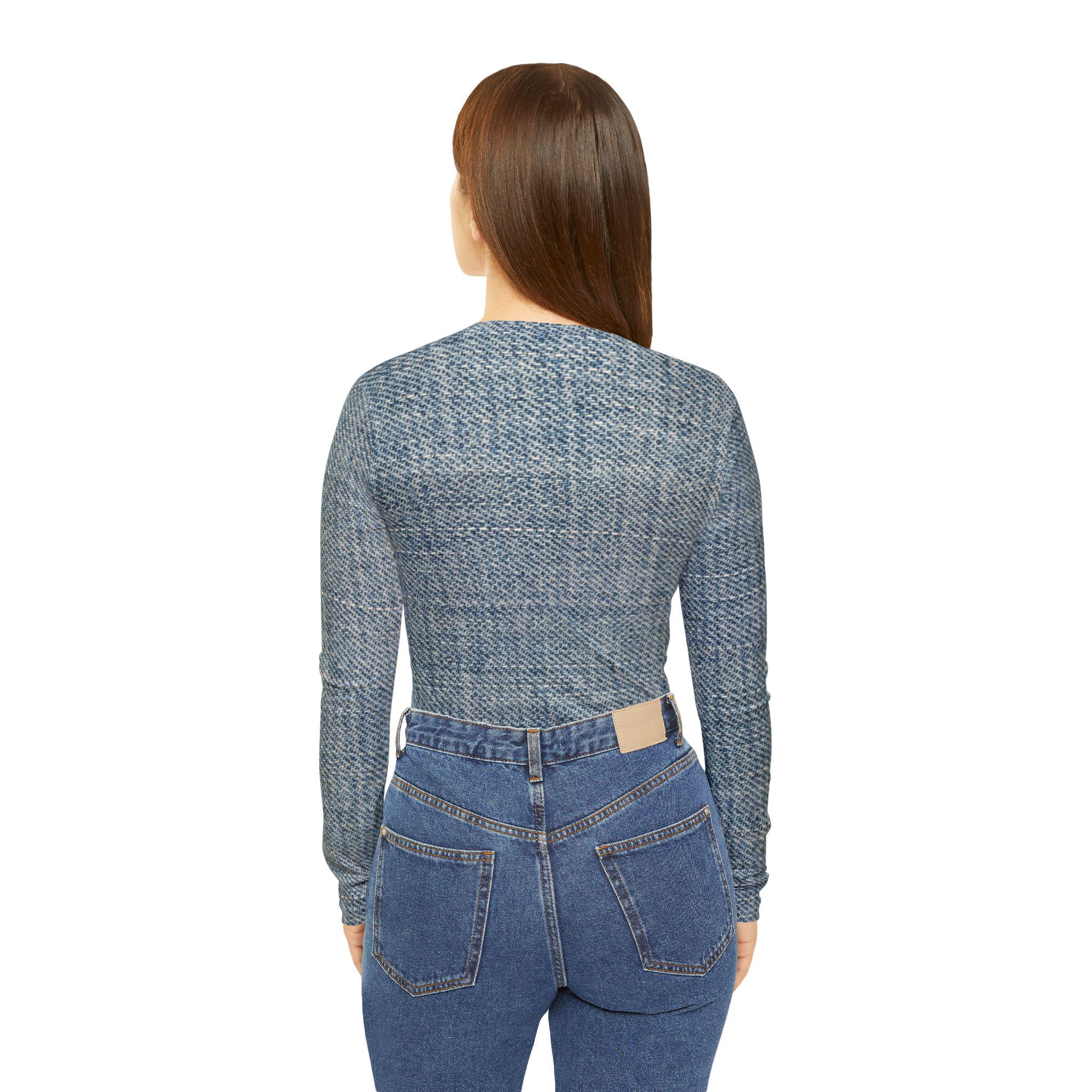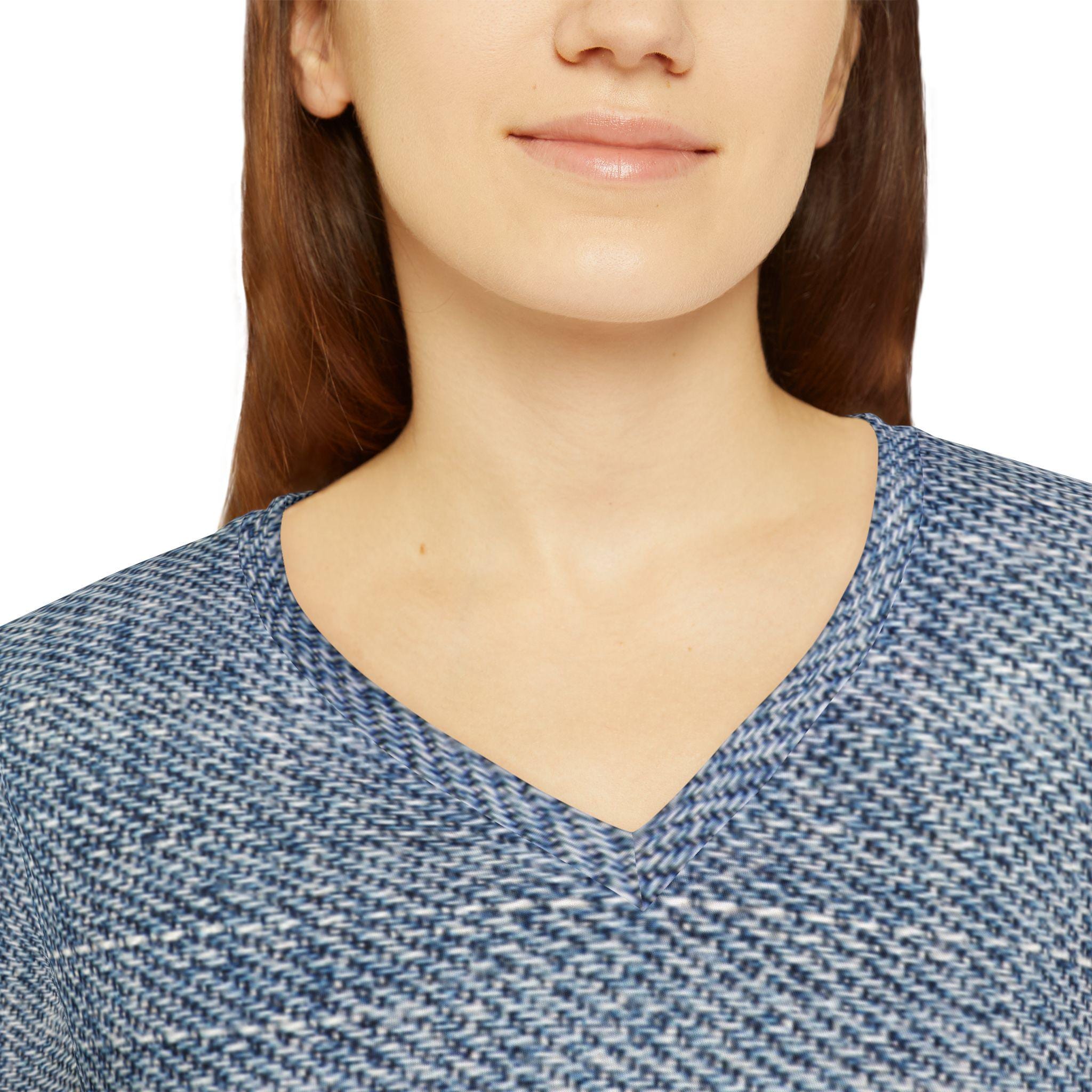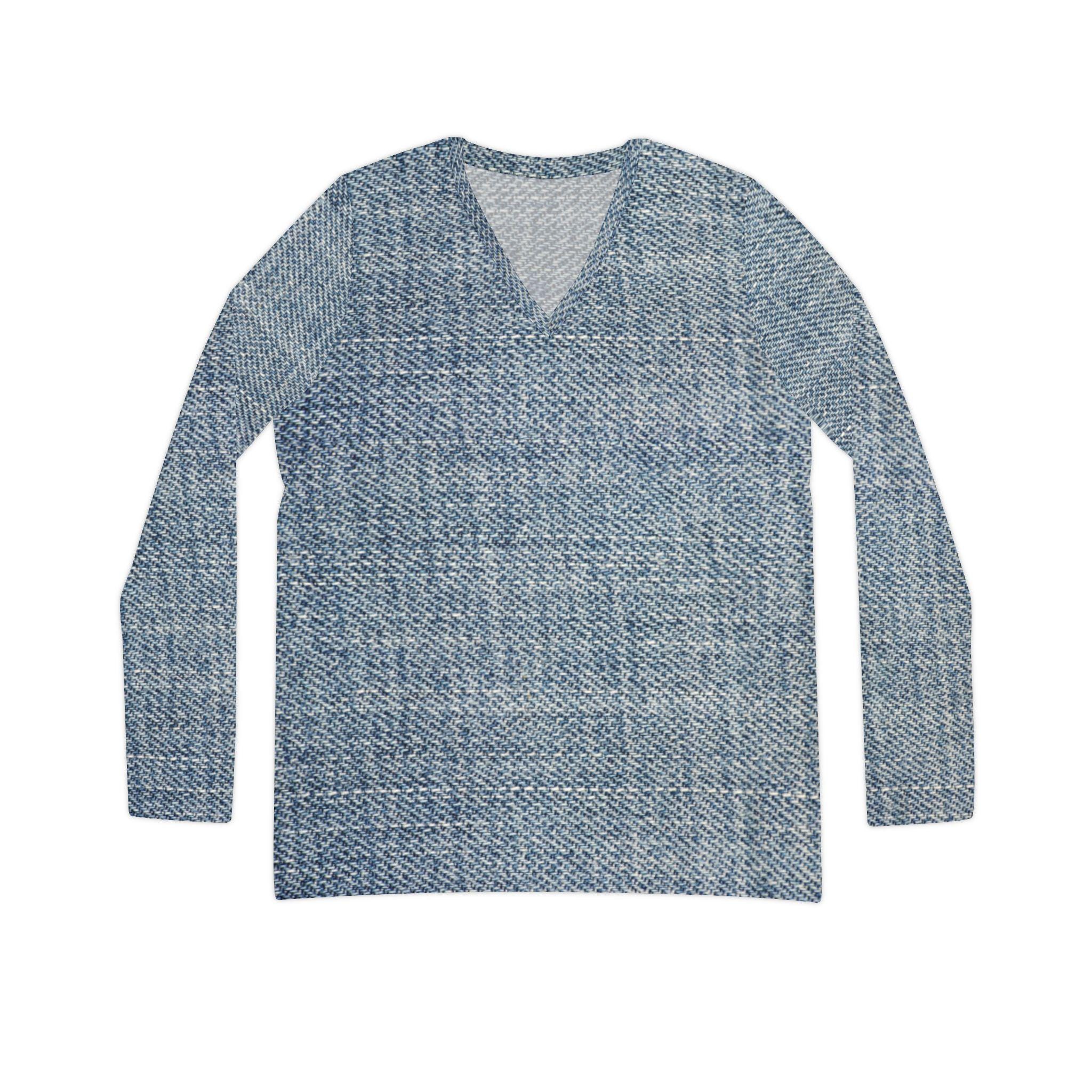 A breezy, lived-in long sleeve V-neck that feels like a familiar favorite from the first wear. The subtle blue woven texture reads like faded denim or washed linen — calm, muted, and easy to layer. Lightweight and stretchy, it moves with you whether you’re running errands, sitting with a book at a café, or layering under a cardigan for a cool morning walk. The clean V neckline and simple silhouette keep the look relaxed and quietly chic. Because the fabric is soft and drapey, it settles comfortably against the body without clinging, inviting casual confidence every time you reach for it.
