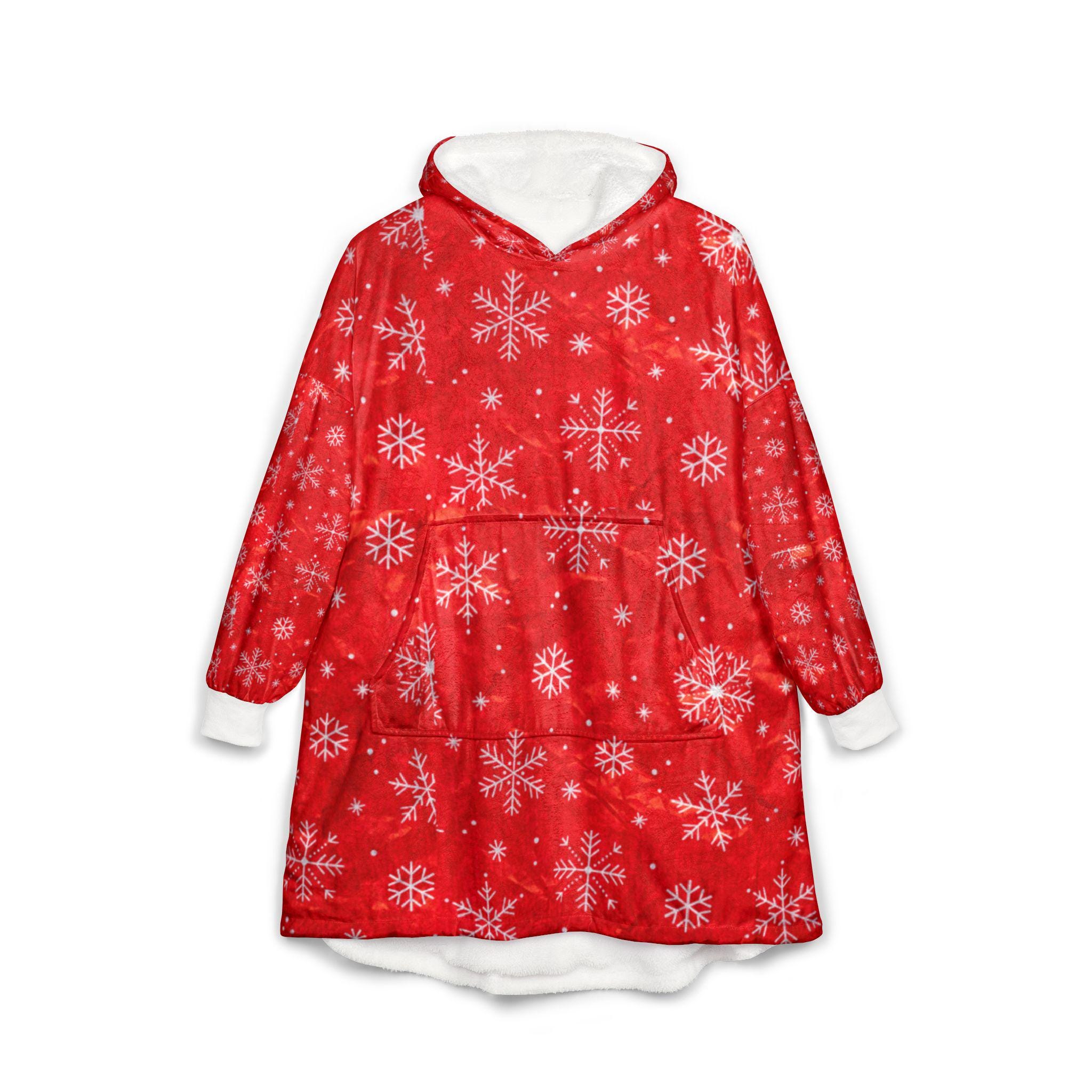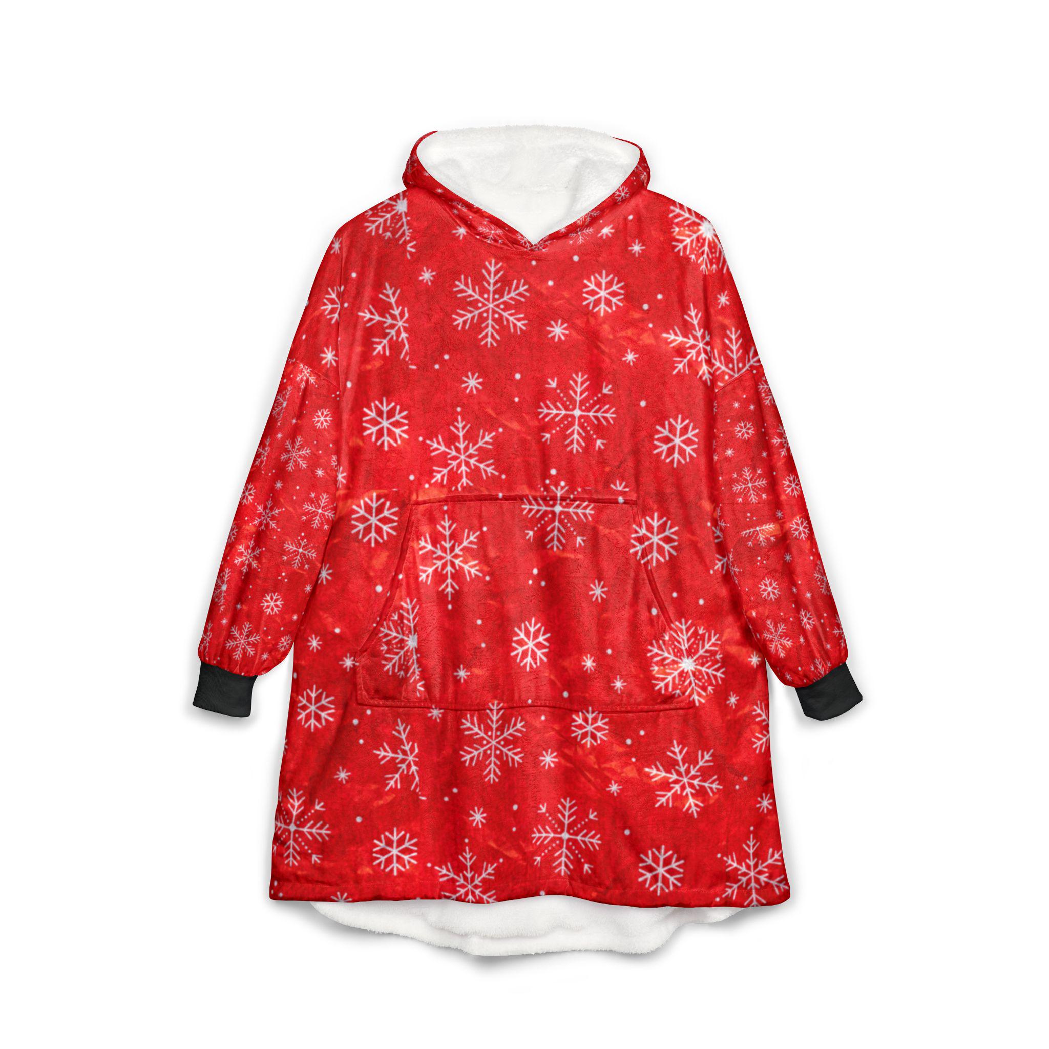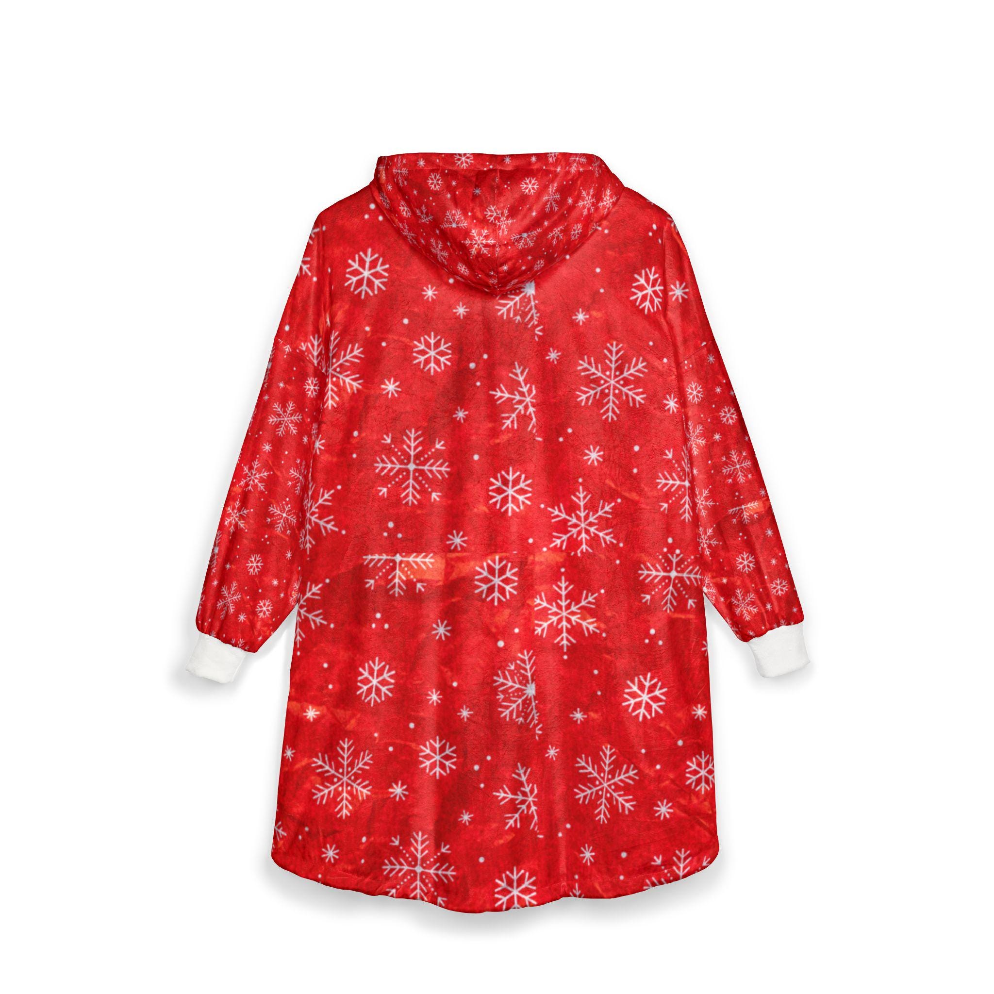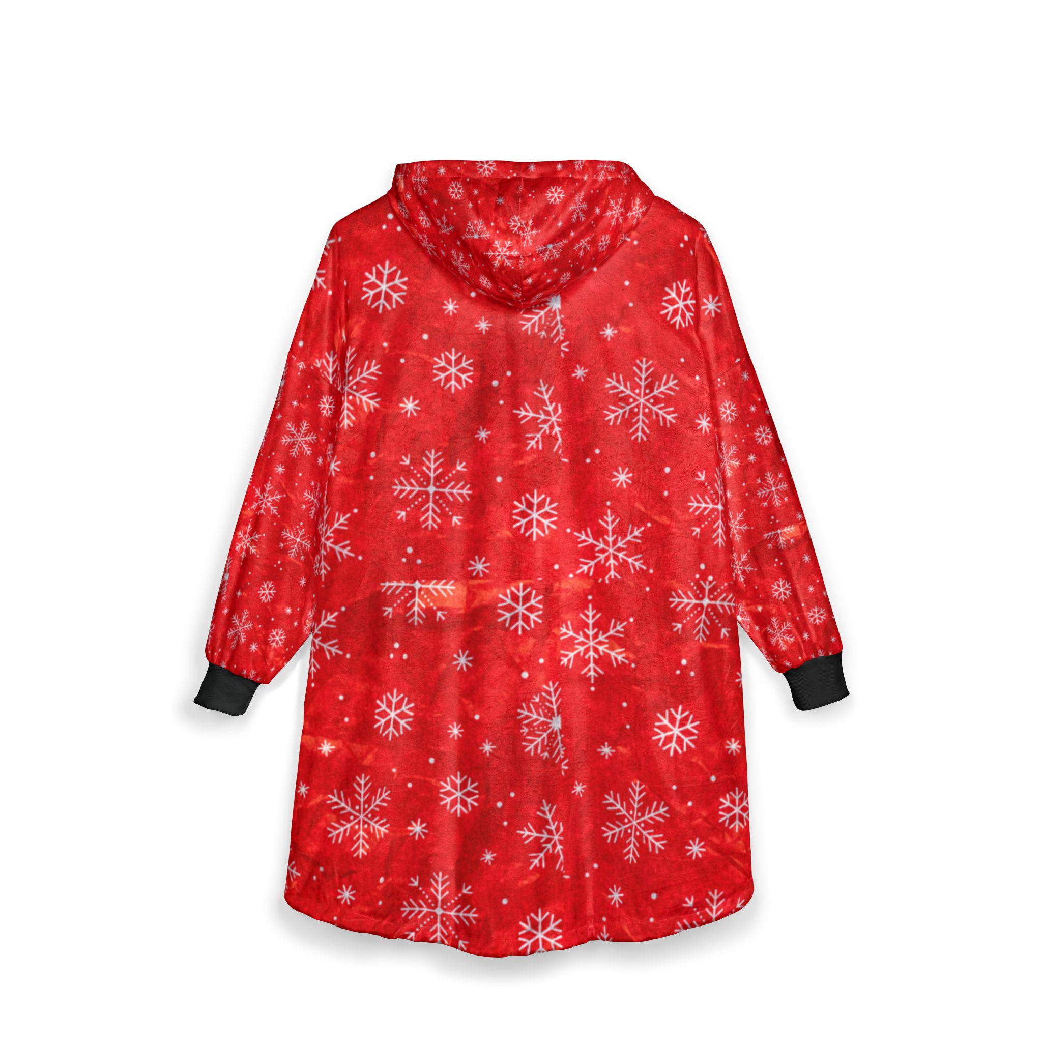 Wrap yourself in cozy holiday warmth with this hooded blanket. The soft polyester fleece feels light against your skin while still holding a comforting, warm embrace. Festive snowflake motifs drift across a rich red background, bringing gentle seasonal cheer whether you're curled on the couch or padding through a chilly morning. The oversized kangaroo pocket keeps hands toasty and holds snacks or a phone. Lightweight and easy to wear, it layers like a wearable throw — great for slow winter mornings, movie nights, or relaxed family gatherings when you want to feel snug without bulk.
