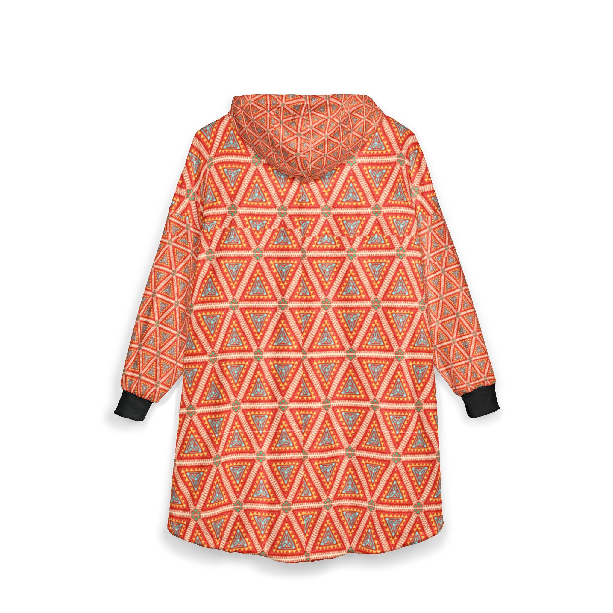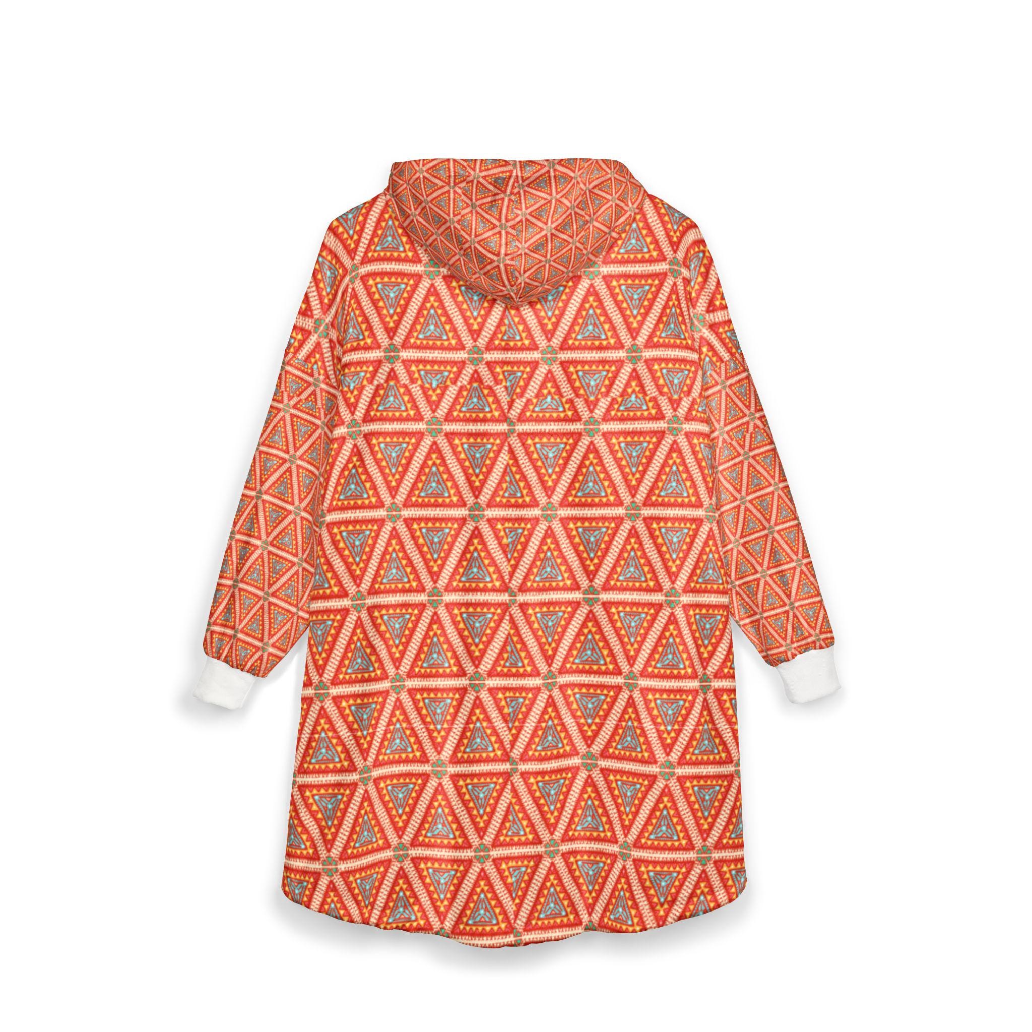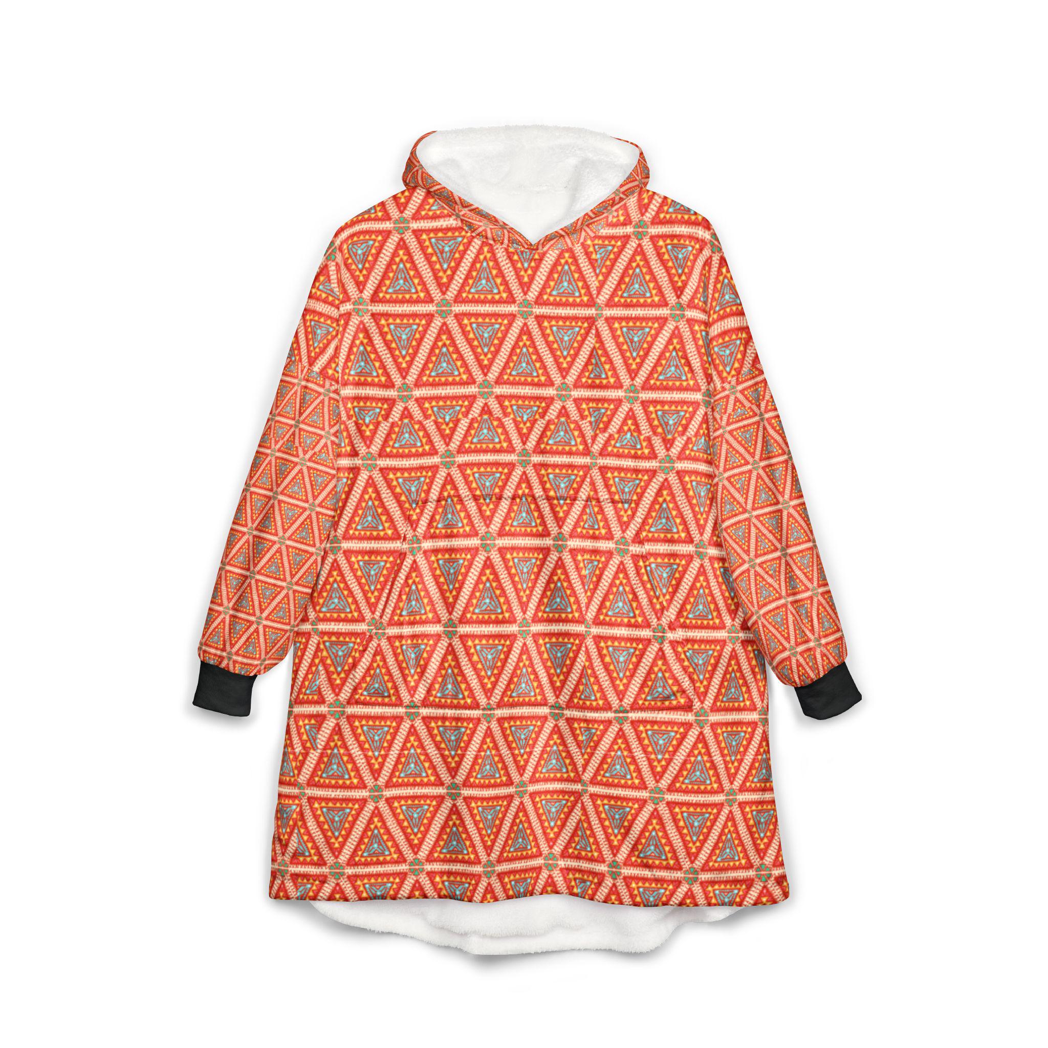 Wrap yourself in a quiet, sunlit calm with this hooded blanket. The warm orange geometric pattern hums with subtle rhythm — small triangles stacking into a meditative field that feels both modern and hand-crafted. It slips on like a soft, wearable throw: the hood tucks against your neck, the oversized silhouette lets you curl up on the couch, and the large kangaroo pocket keeps hands warm or holds a snack for movie night. The fleece is lightweight yet cozy, so you can wear it for long stretches without feeling weighed down. Bring it out for slow mornings with coffee, late-night reading sessions, or laid-back evenings by the window. It’s for people who love color that soothes rather than shouts, and who treasure simple, comfortable rituals at home.
