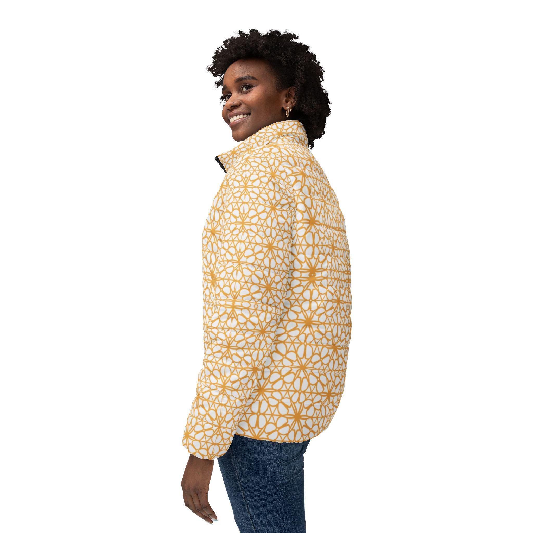 Wrap yourself in soft warmth with this lightly padded puffer jacket. The quilted white sleeves and collar frame a honey-gold mosaic panel that feels both cozy and quietly refined. It slips on easily with a smooth black zipper and keeps small essentials tucked away in slanted side pockets. The medium-weight polyester shell holds its shape and color through daily adventures, while the cotton-like padding adds gentle loft without bulk. Wear it on brisk mornings when you want a calm, curated look that still protects against the chill.