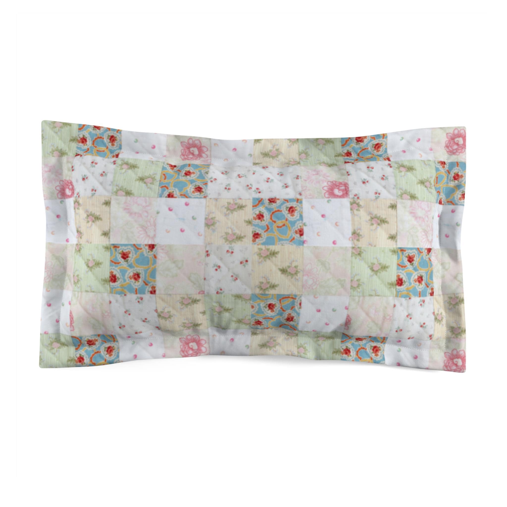 Soft, quilt-inspired pillow sham that brings a gentle, vintage-fresh touch to a calm bedroom or cozy reading nook. The brushed microfiber surface carries a faded patchwork pattern in muted pastels — mint, blush, cream, and warm taupe — that feels like a well-loved heirloom without the care fuss. Lightweight and smooth to the hand, the sham slips over your insert through a double-layer envelope closure for a neat finish and stays comfortably in place. It layers beautifully with solid throws and linen sheets, lending a quiet, homey atmosphere to slow mornings, restful afternoons, or lazy weekend reading sessions.