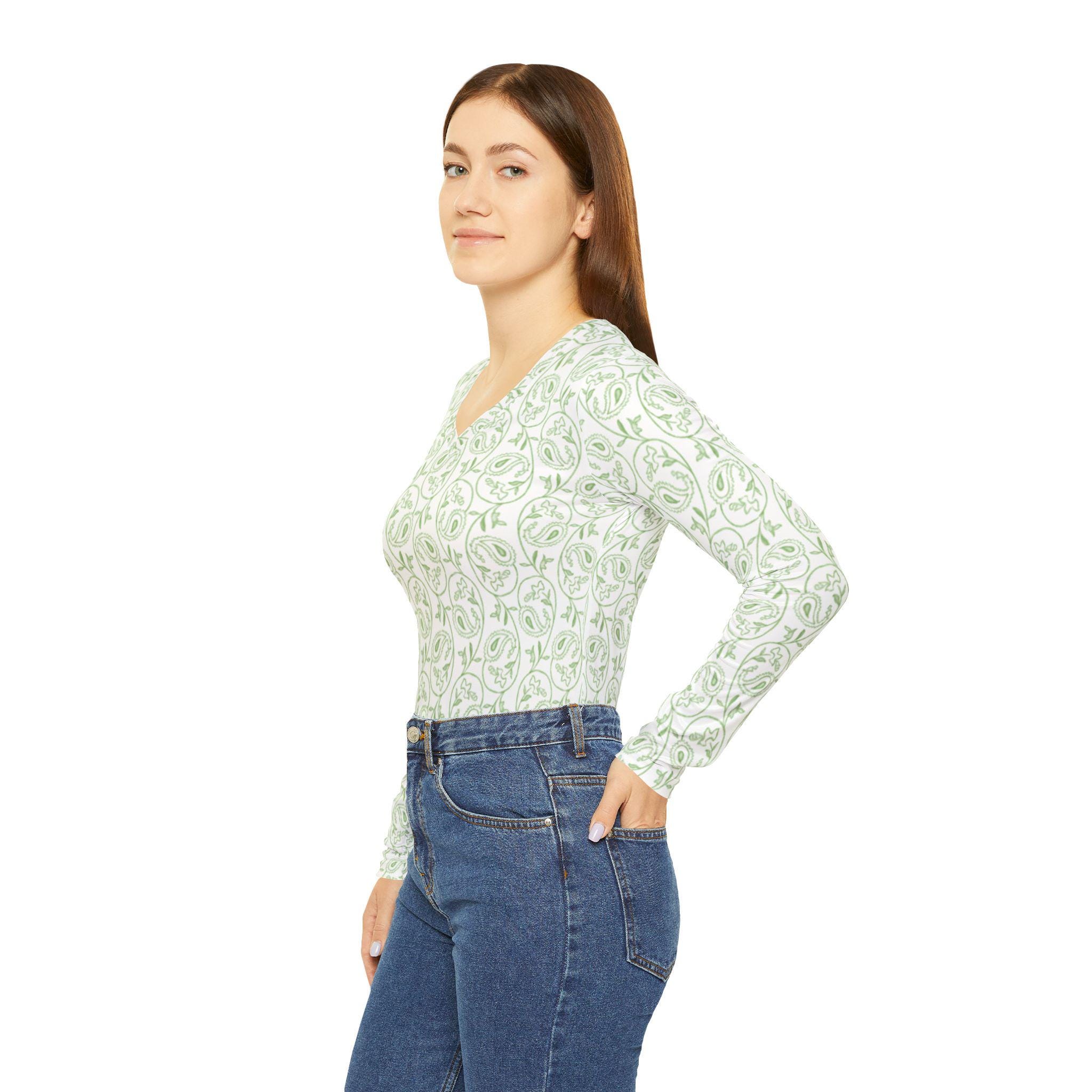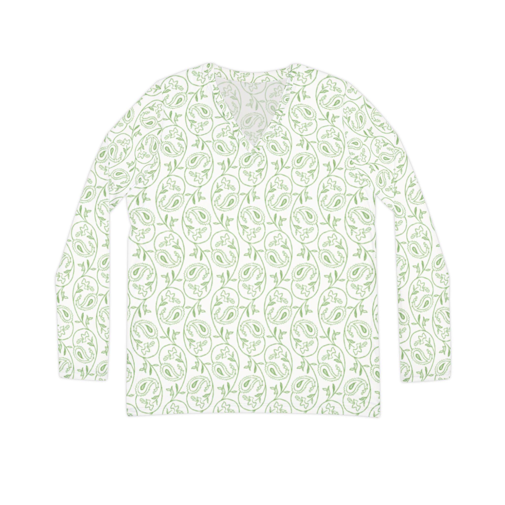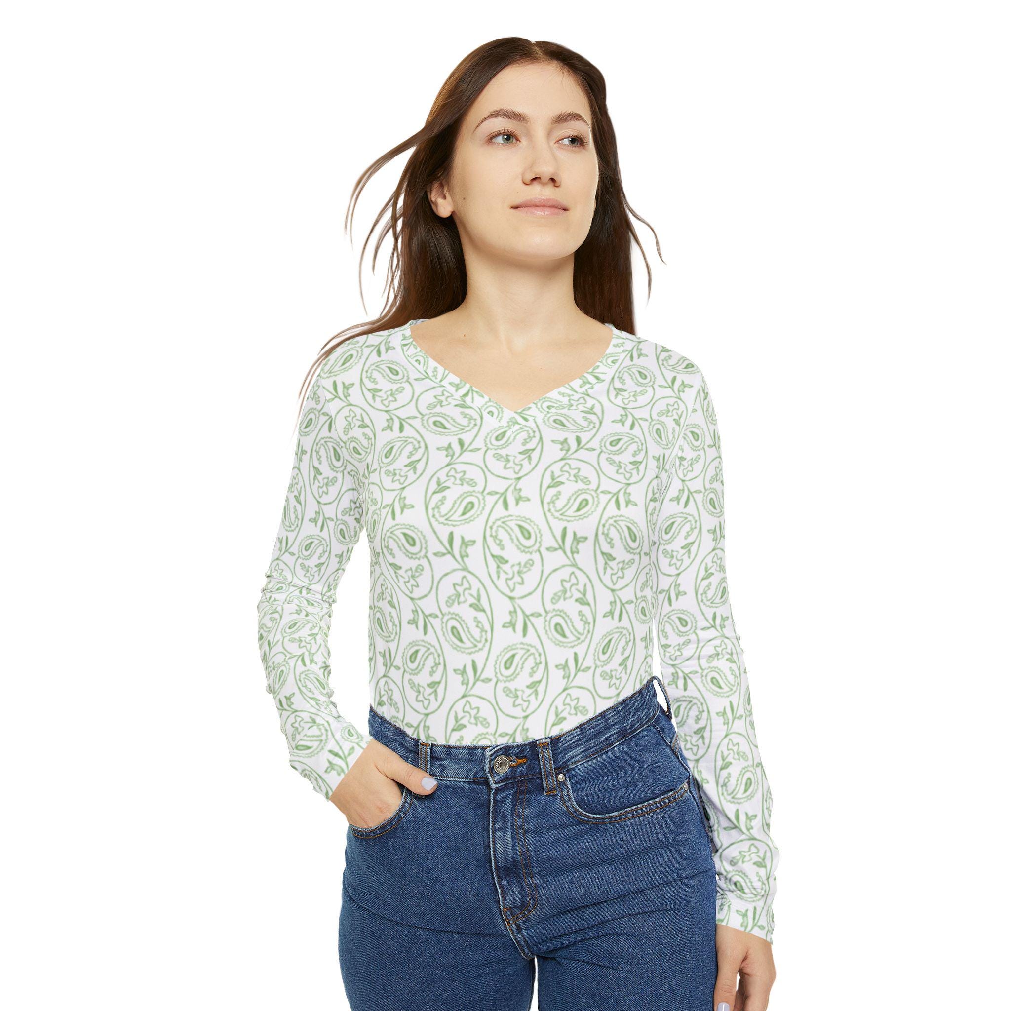 Light as a breath and patterned with a gentle vine motif, this long-sleeve V-neck is for days when you want comfort without shouting. The soft, slightly stretchy fabric drapes naturally, moving with you while the subtle sage-green scrolls add a quiet, botanical touch. Wear it for slow mornings with tea, walks through neighborhood parks, or layered under a cardigan for a casual brunch. It feels lived-in from the first wear and brings a calm, natural rhythm to everyday outfits—an easy layer that speaks to a love of simple, green details.