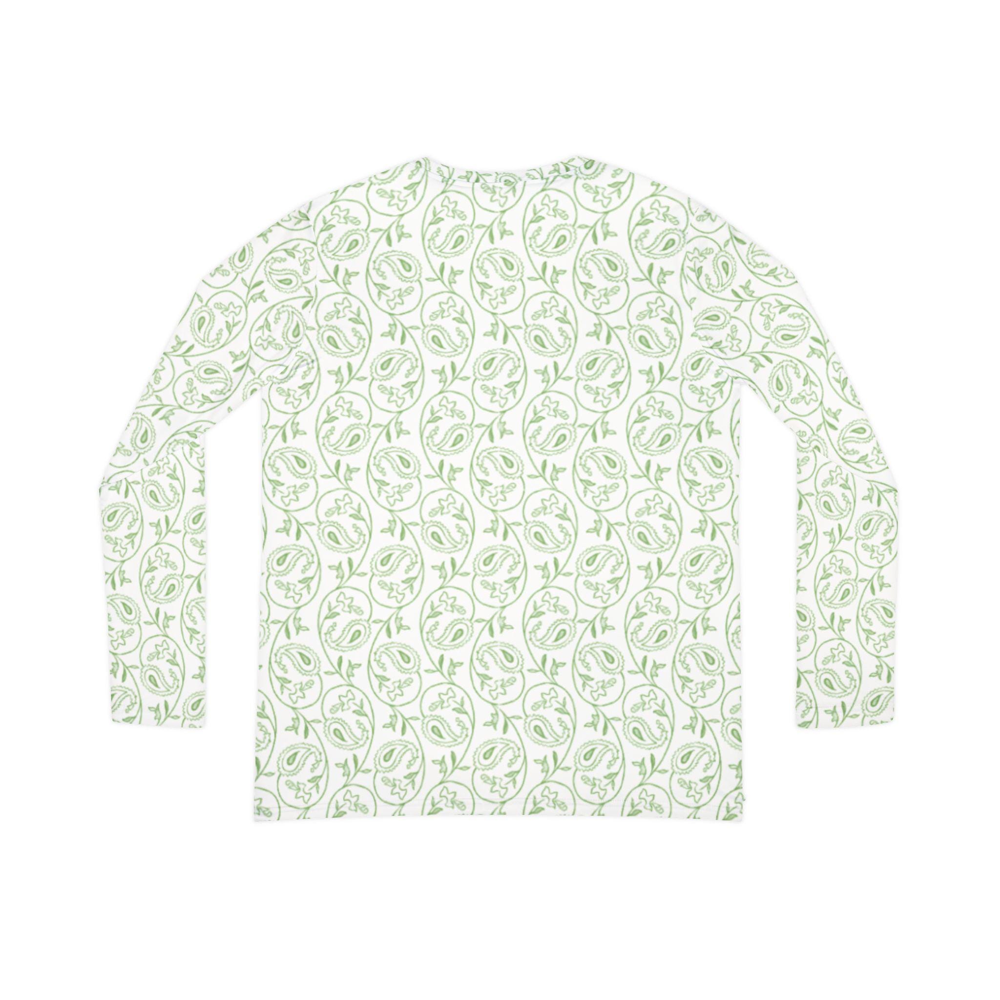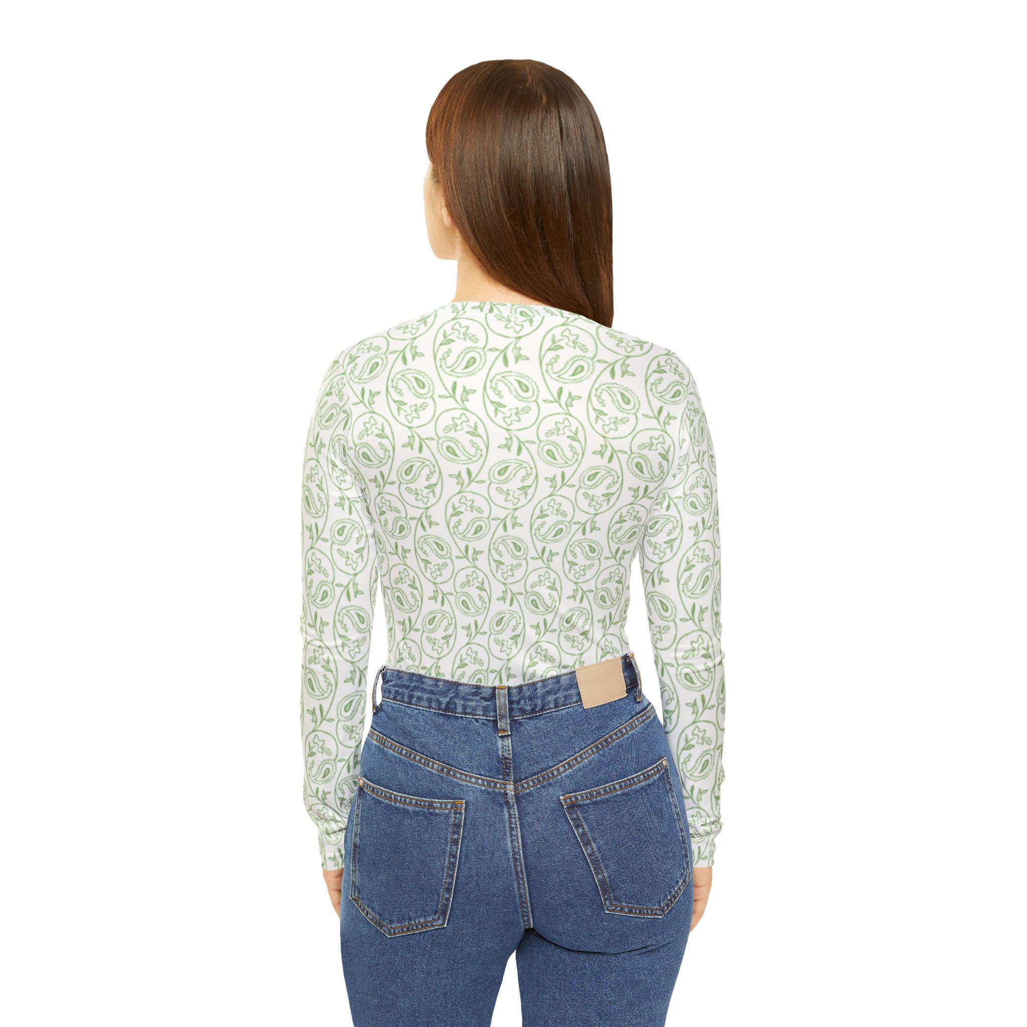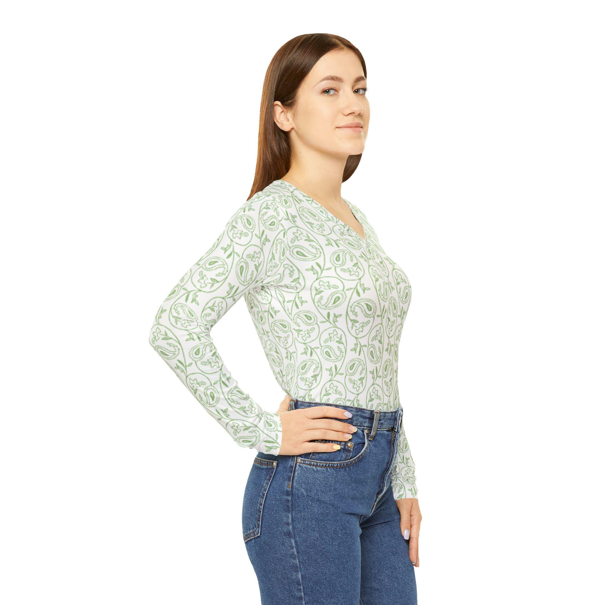 Light as a breath and patterned with a gentle vine motif, this long-sleeve V-neck is for days when you want comfort without shouting. The soft, slightly stretchy fabric drapes naturally, moving with you while the subtle sage-green scrolls add a quiet, botanical touch. Wear it for slow mornings with tea, walks through neighborhood parks, or layered under a cardigan for a casual brunch. It feels lived-in from the first wear and brings a calm, natural rhythm to everyday outfits—an easy layer that speaks to a love of simple, green details.