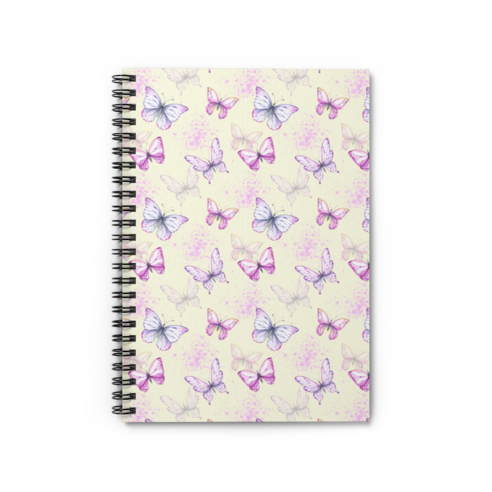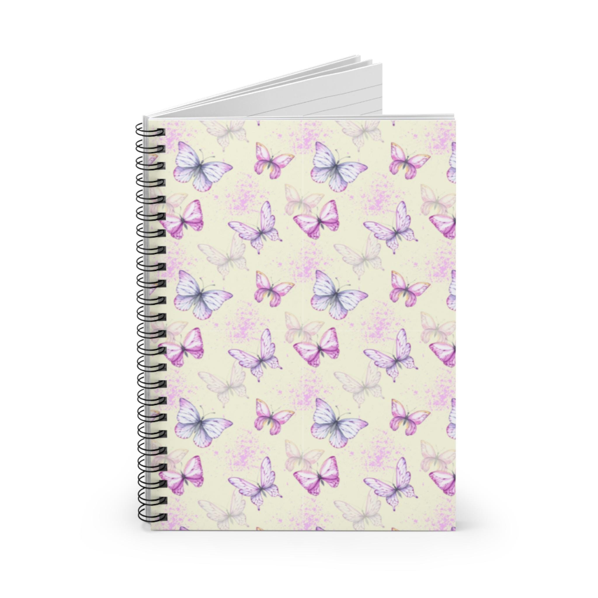 Soft watercolor butterflies drift across a pale, buttery background—this spiral notebook feels like a quiet afternoon of gentle thoughts. The ruled pages invite lists, journal entries, and study notes, while the sturdy metal spiral lets the book lie flat for easy writing. A slim document pocket inside the back cover keeps receipts, stickers, or loose notes tucked away. Carry it in a tote or set it on your desk as a calm, pretty place to collect ideas and memories.