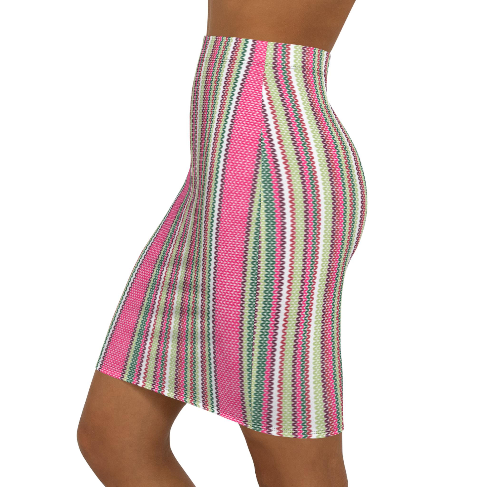 A sleek mid-waist pencil skirt patterned in lively vertical stripes—soft pinks, muted greens, and cream tones blend into a playful yet refined look. The slim, body-hugging silhouette flatters the waist and hips while the elastic waistband keeps comfort at the forefront. Lightweight stretch fabric moves with you, so this skirt works for busy days at the café, casual gallery nights, or layered looks for weekend brunch. The all-over print gives continuous, eye-catching color from front to back, while the mid-waist cut reads modern and confident. Thoughtfully assembled in the USA with durable stitching and sewn-in care label, it blends everyday wearability with bright, statement-making style.