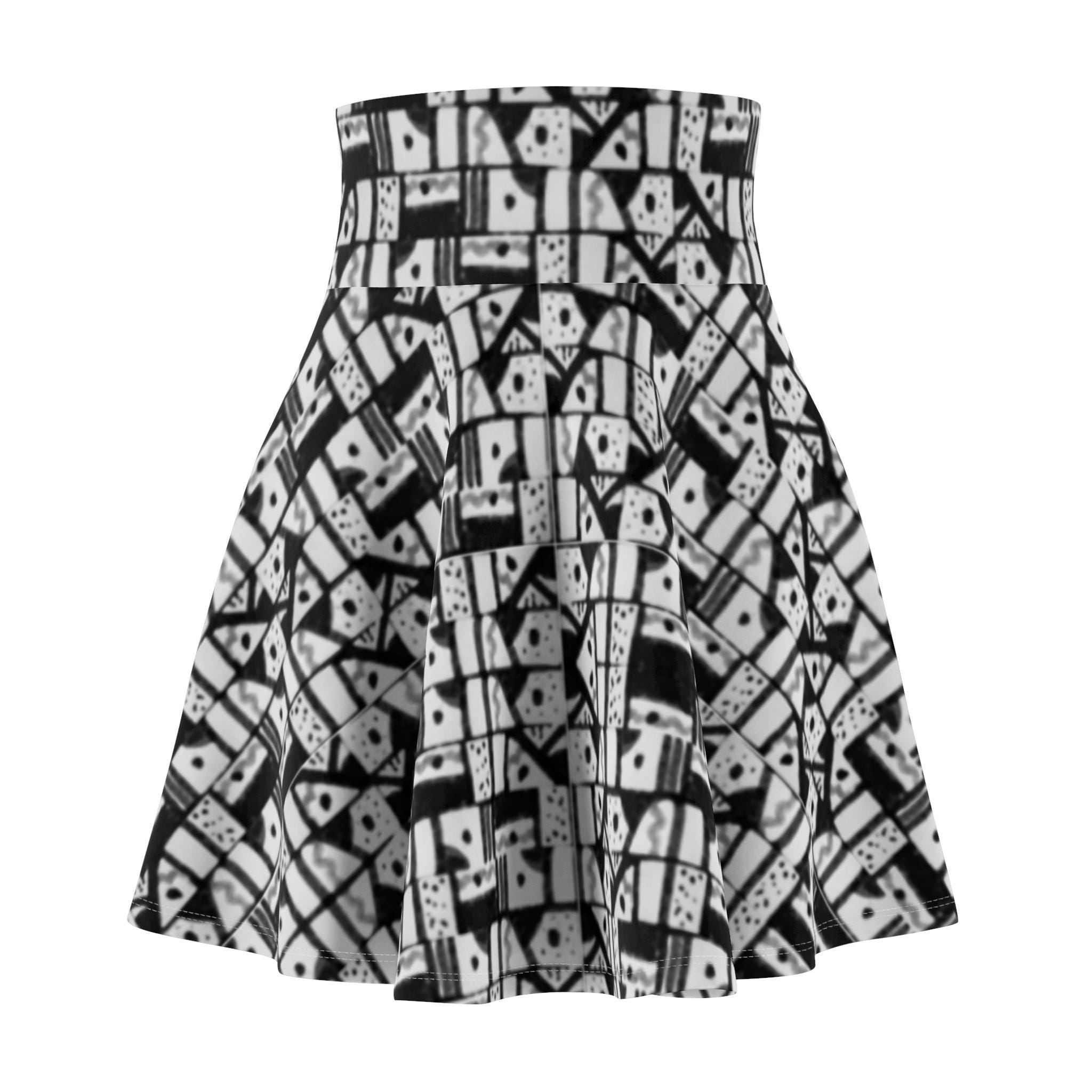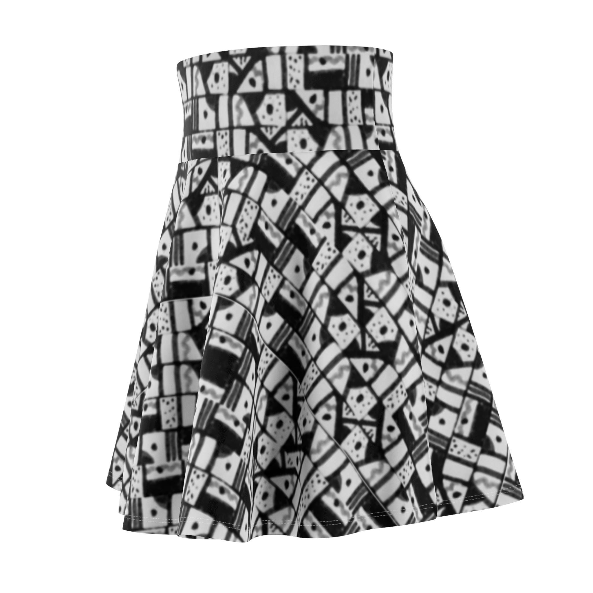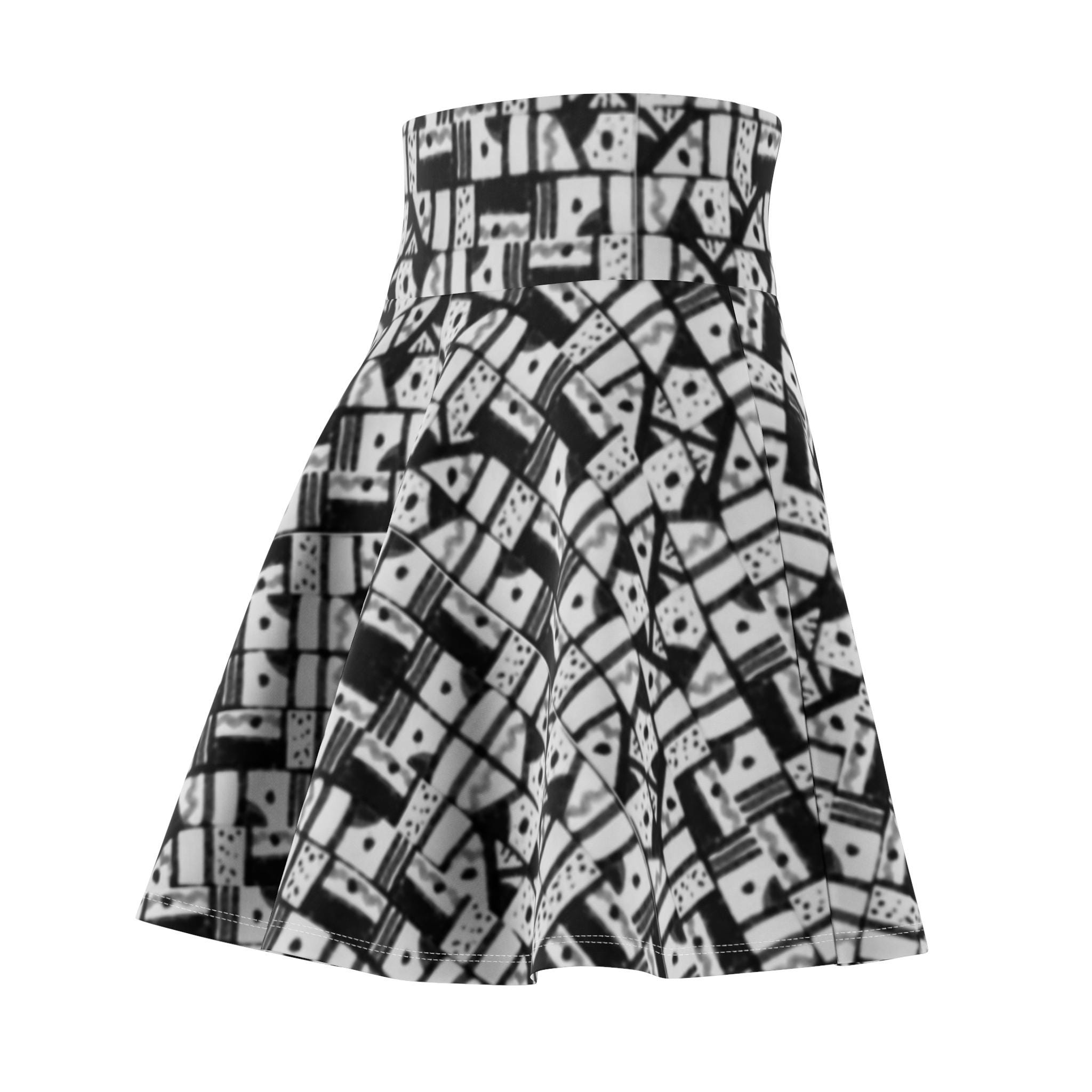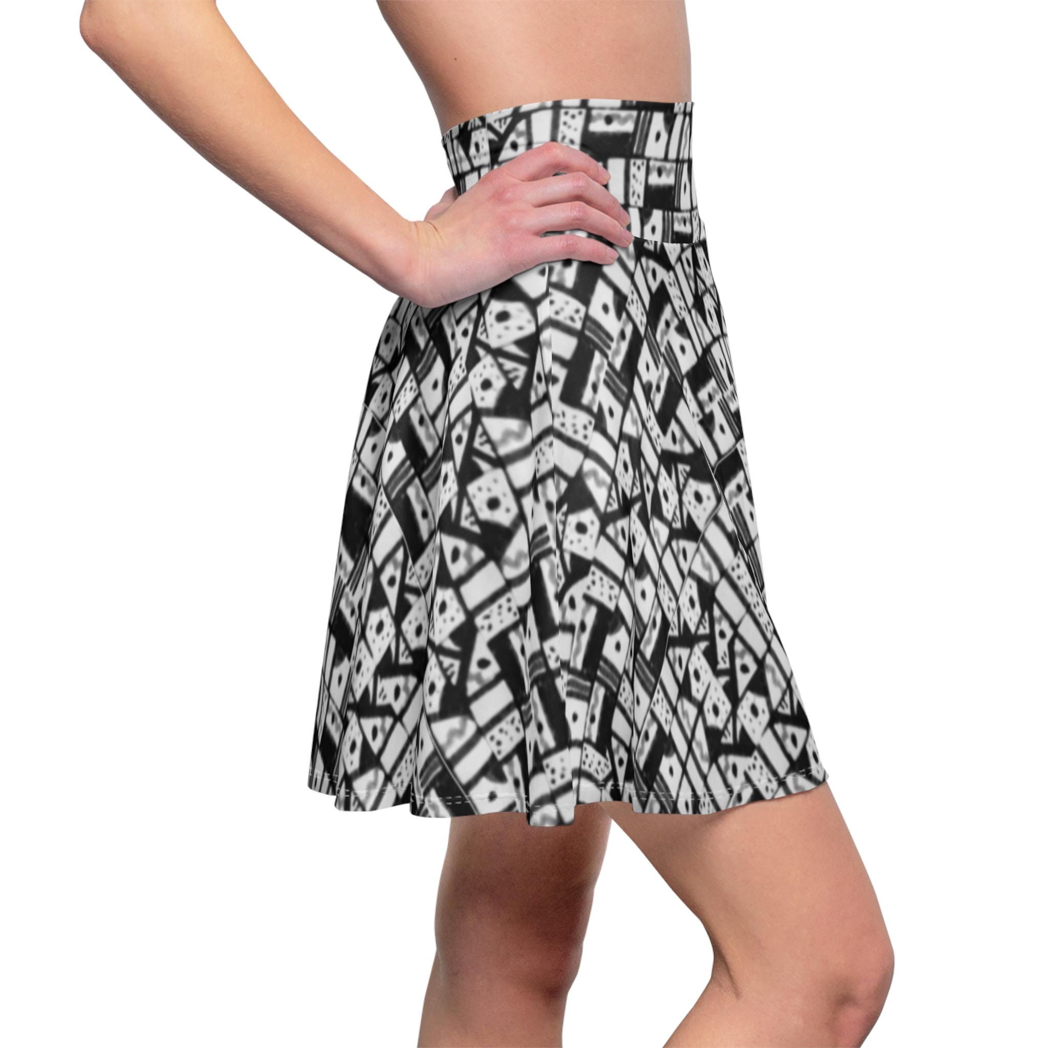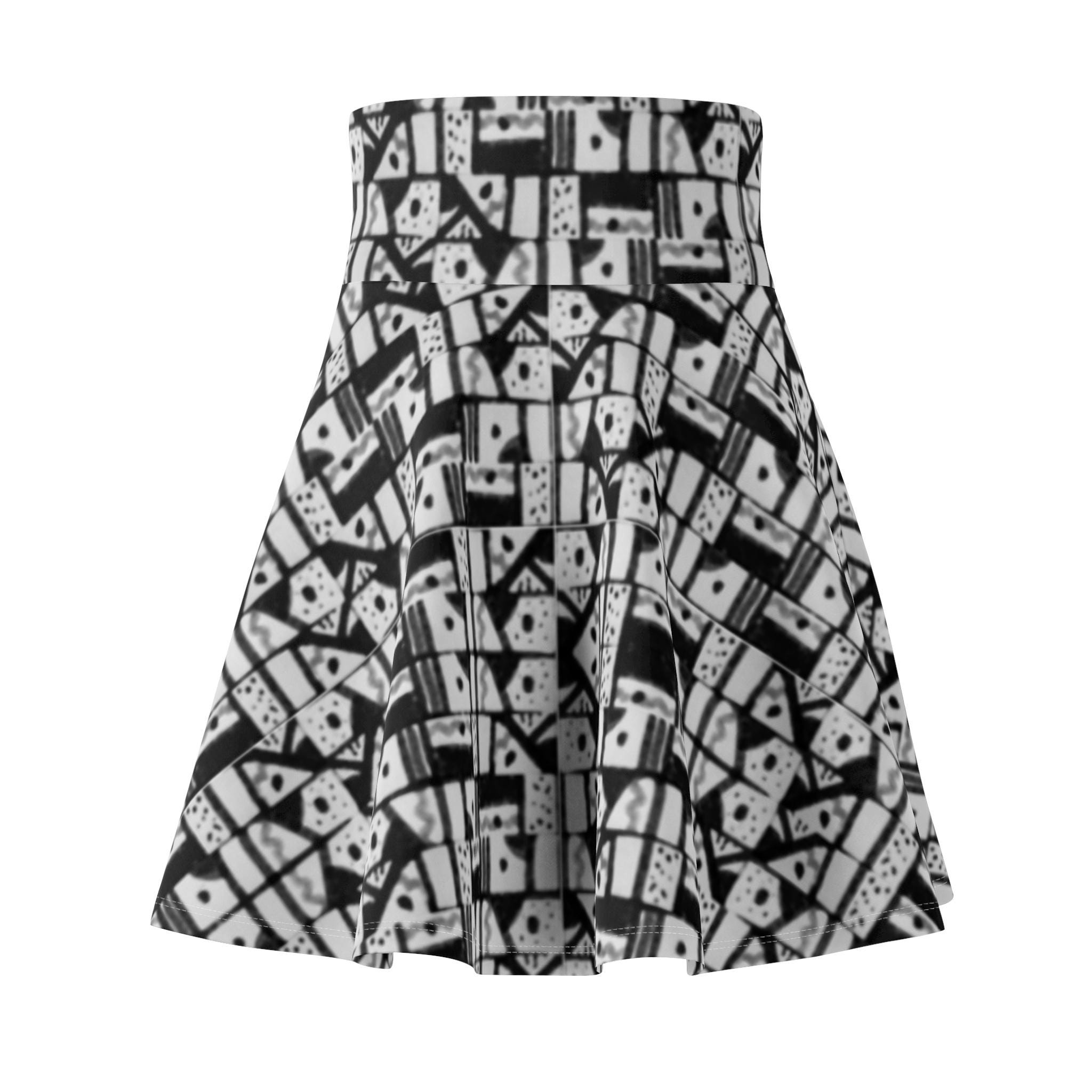 This flared skater skirt brings playful movement and bold monochrome style to everyday wear. The high-rise double waistband sits comfortably at the waist, while the all-over graphic print — a dynamic, slightly blurred collage of small house/keyhole motifs — creates a sense of motion with every step. Lightweight, stretchy fabric hugs the waist and then releases into a flattering, twirl-ready silhouette. Wear it with chunky boots and a cropped sweater for city wanderings, or pair with sandals and a tucked tee for weekend coffee runs. The stitching lies flat against the skin, and the printed care label keeps the interior clean and minimal. Crafted with attention to comfort and silhouette, this skirt feels both confident and effortless.