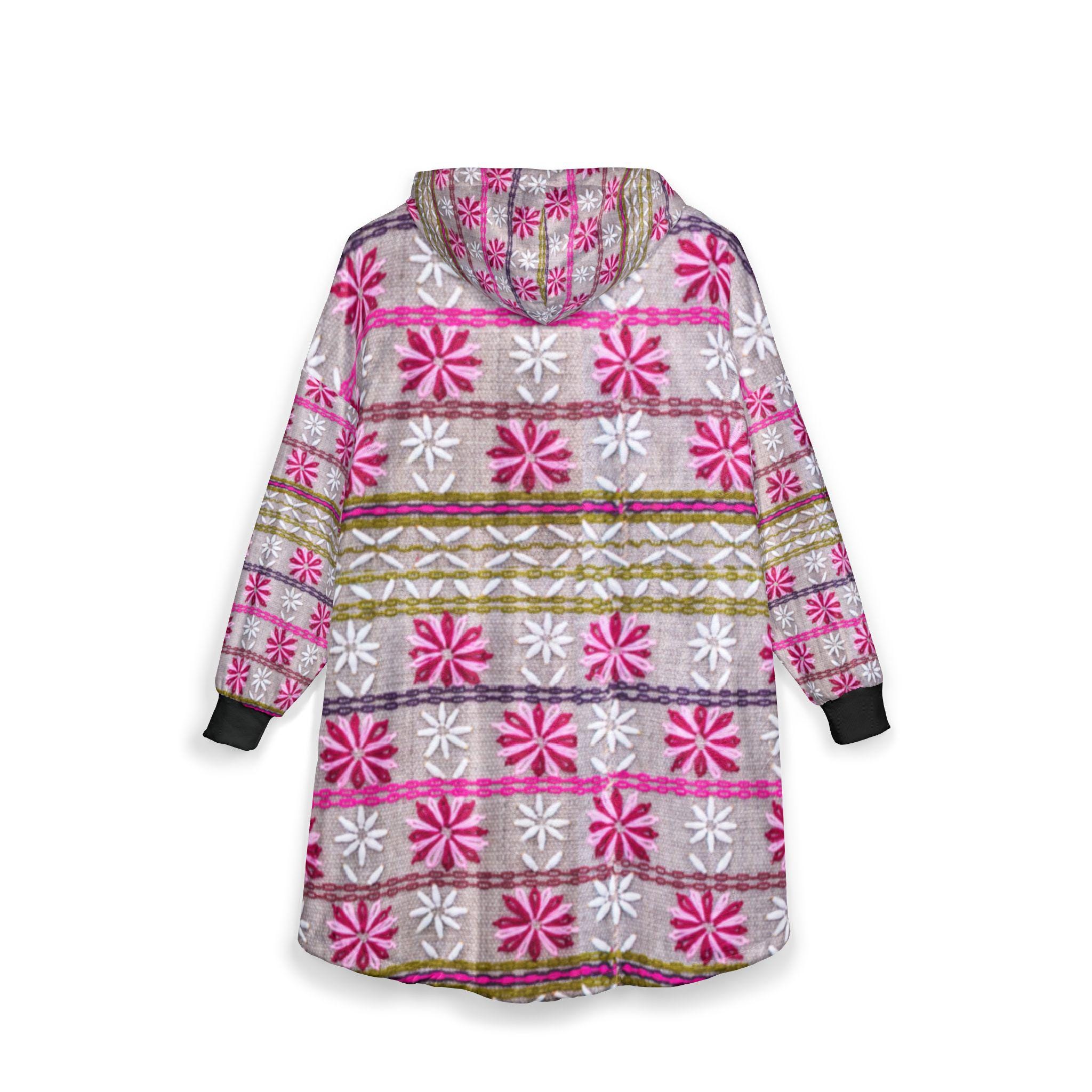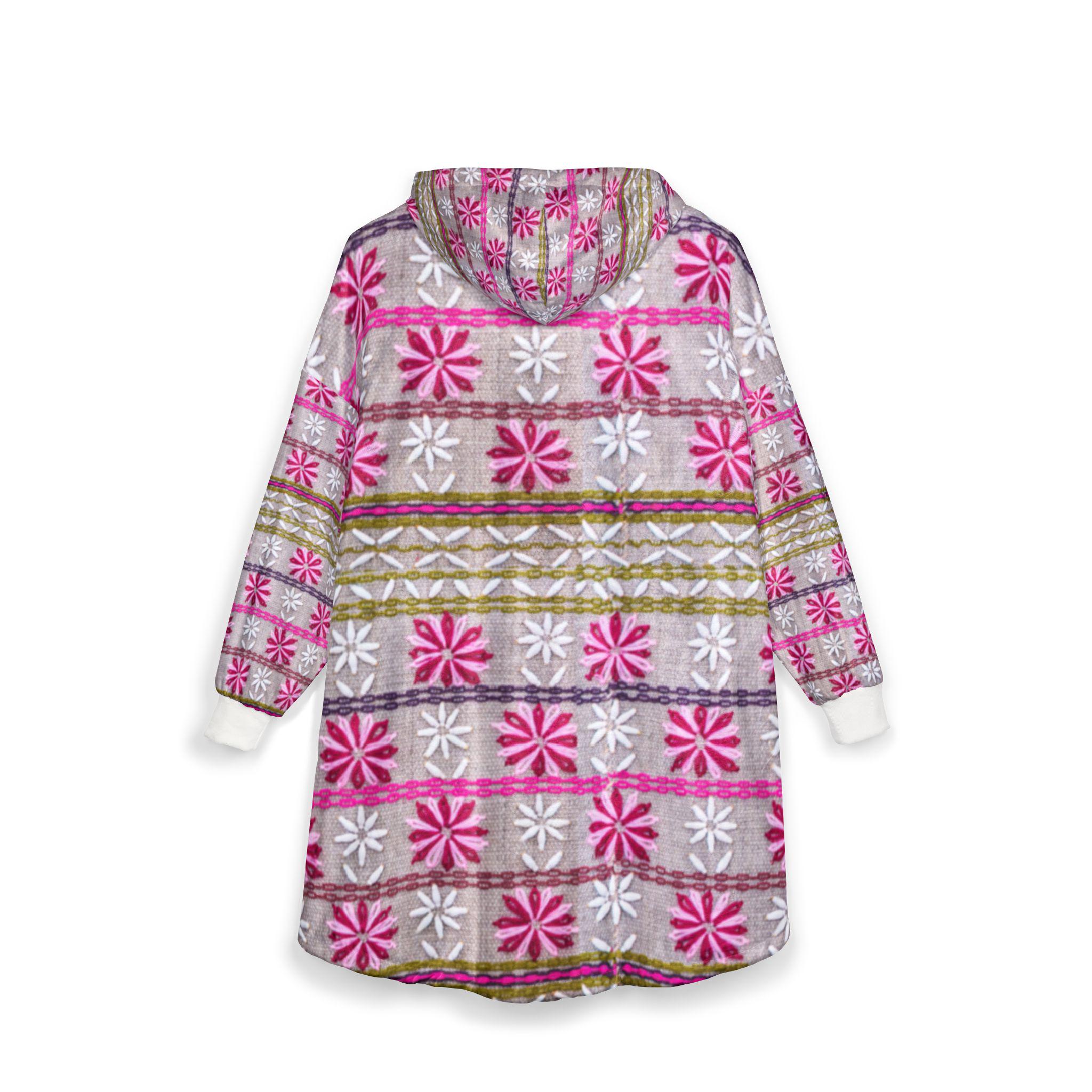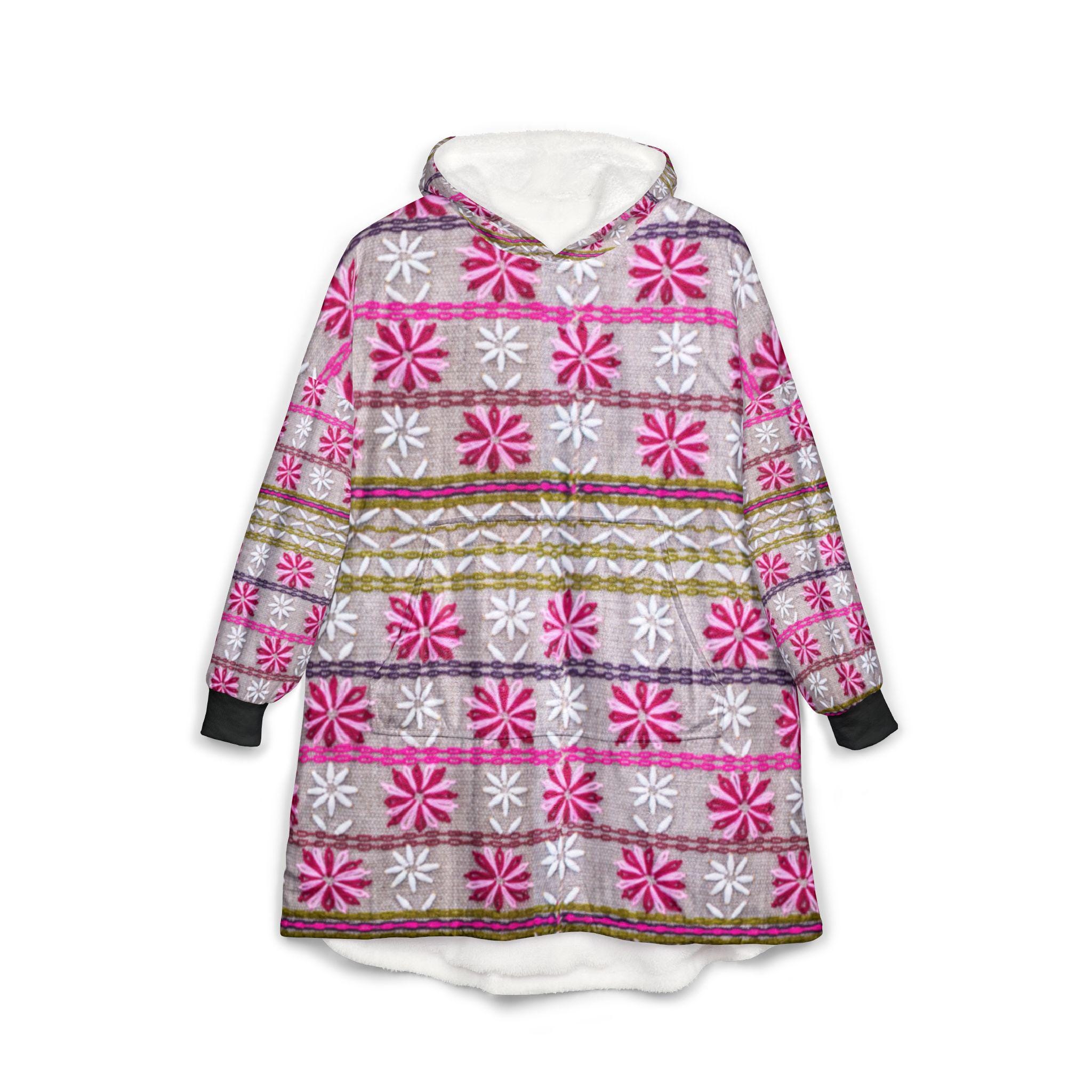Wrap yourself in a cozy, wearable blanket that feels like a warm hug on quiet mornings and low-key movie nights. The oversized hood and roomy kangaroo pocket make this piece a little sanctuary — tuck your hands, snacks, or phone inside and settle in. The soft polyester fleece holds color beautifully, so the playful pink-and-gray geometric motif keeps looking bright through regular use. Lightweight and snuggly, it layers easily over pajamas or loungewear and makes cold evenings calmer and more comfortable.