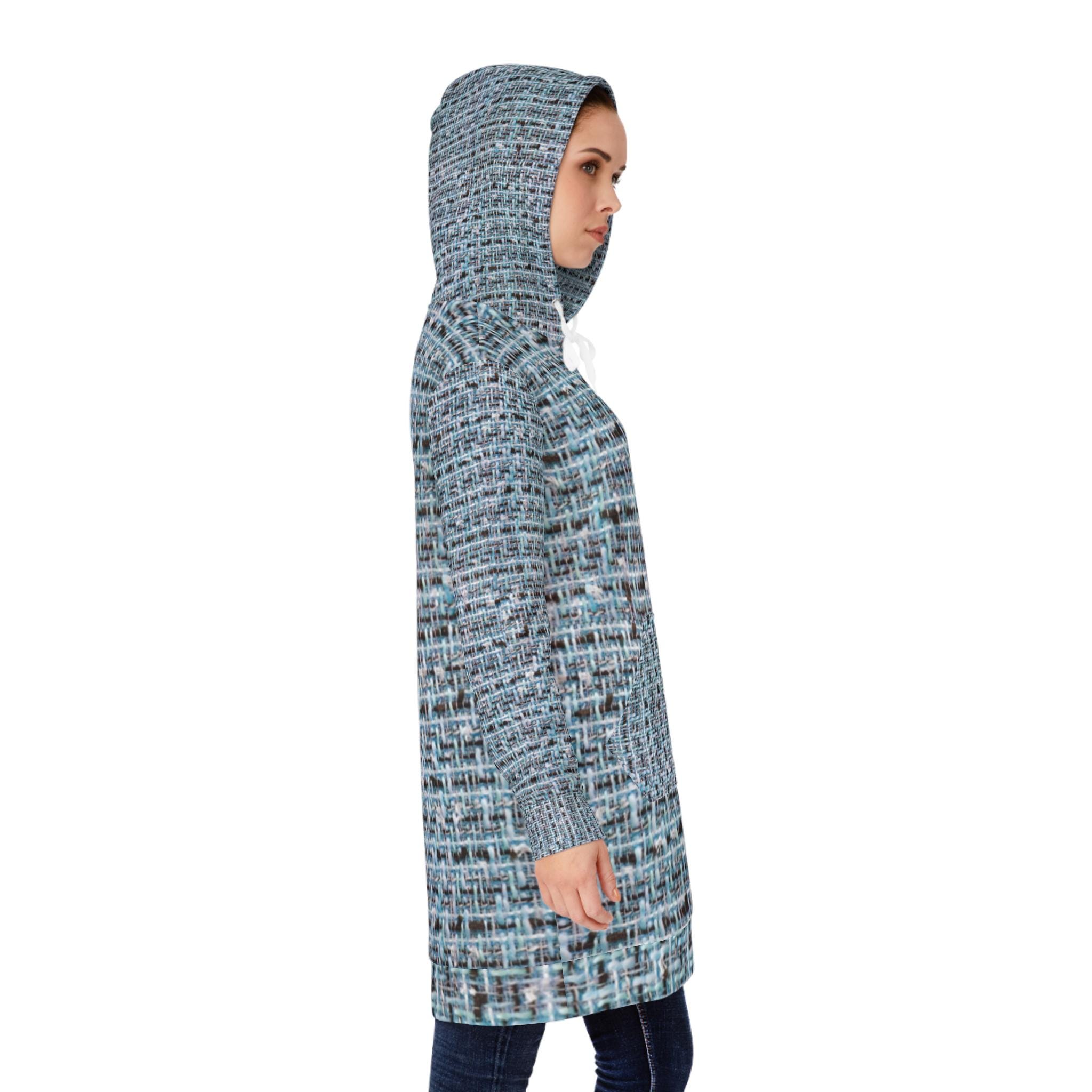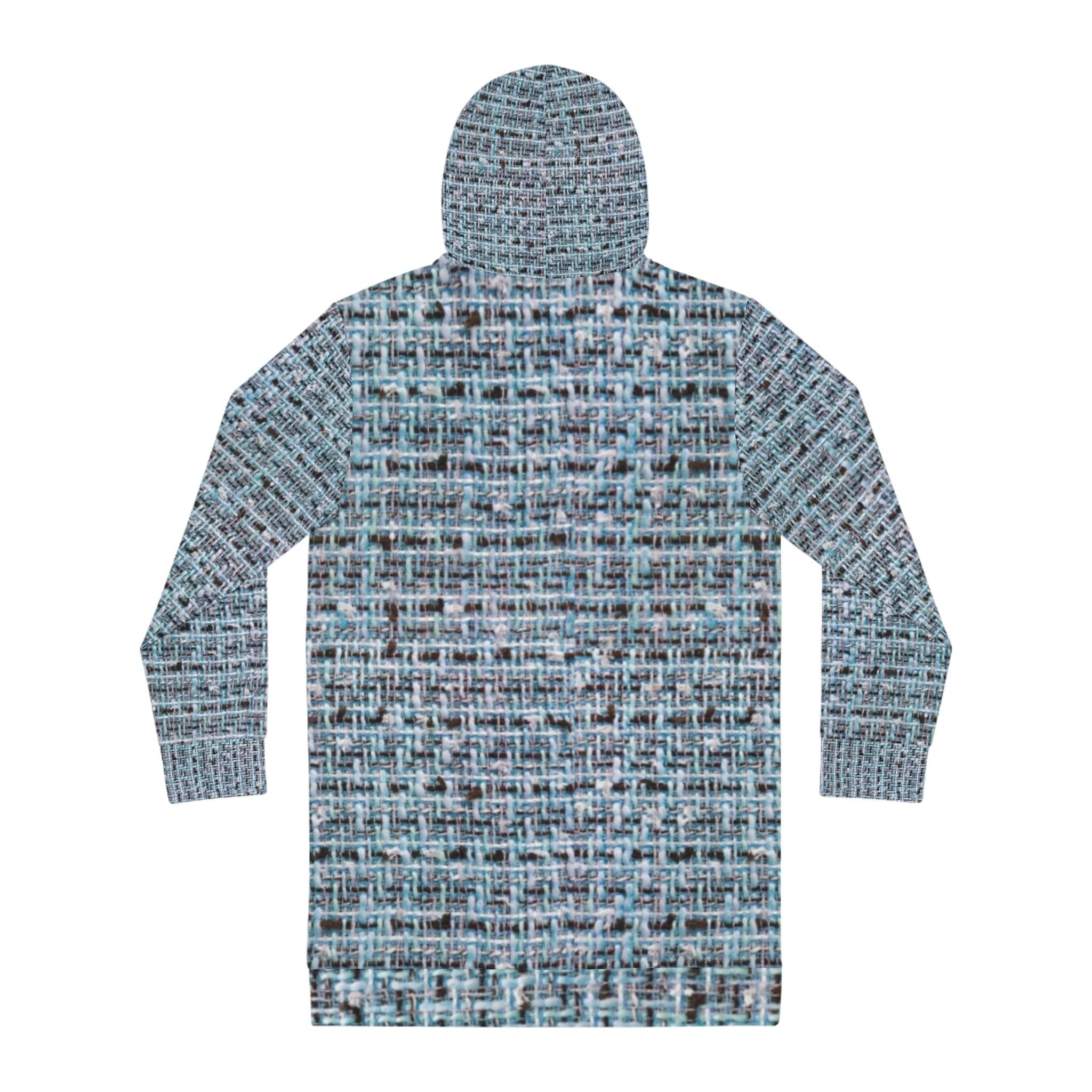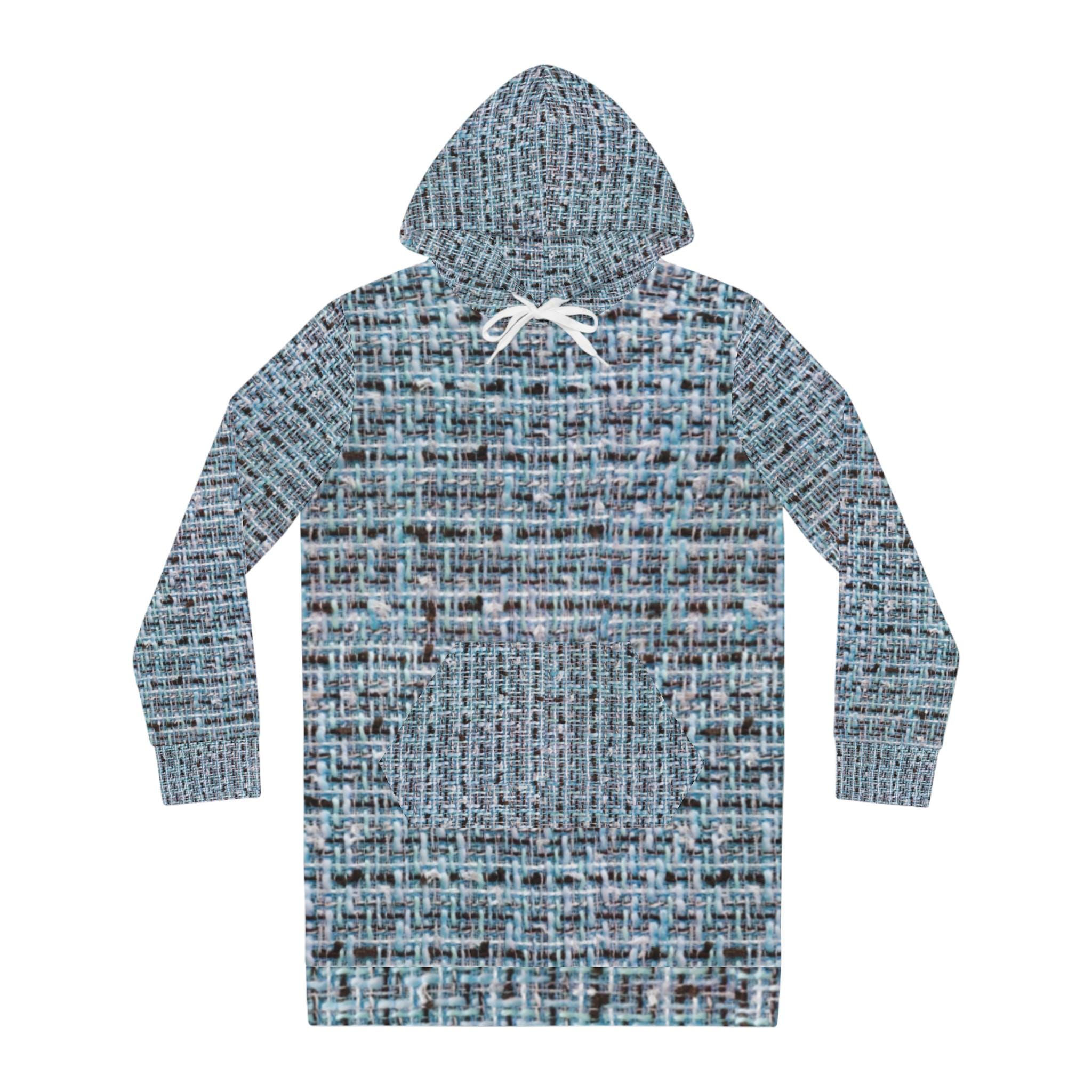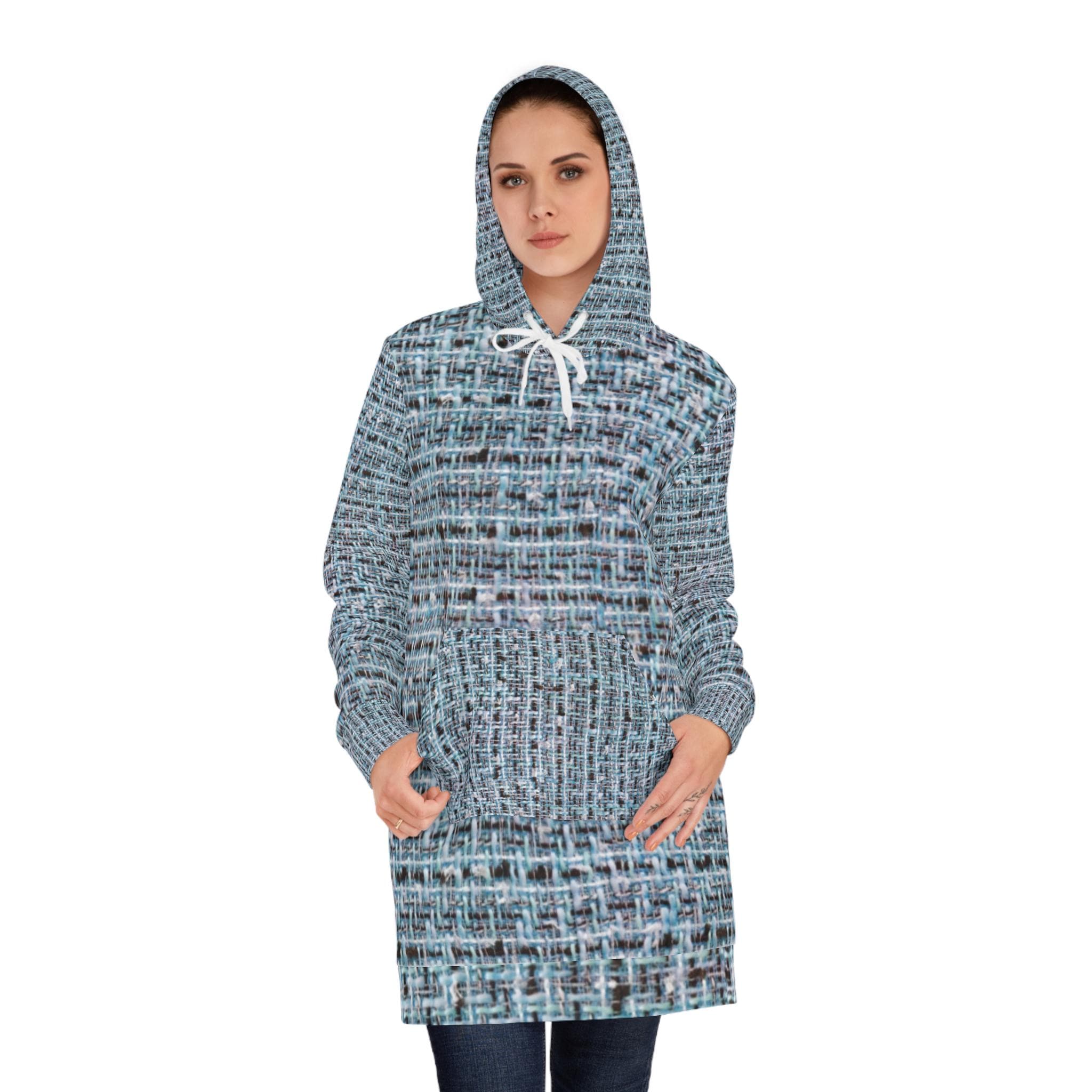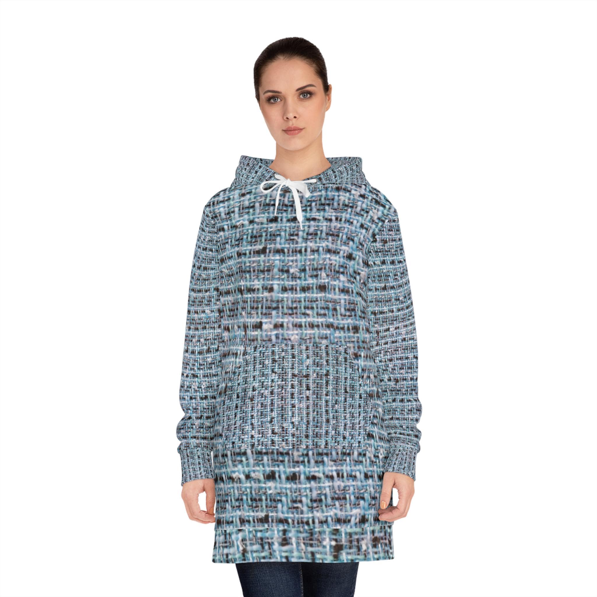 This hoodie dress wraps you in a soft, tactile weave of color — a cozy, oversized layer that reads like a lived-in knit. The all-over textured print mimics chunky boucle, giving the dress a handcrafted, layered look without the bulk. Slide your hands into the roomy kangaroo pocket, pull the adjustable hood up against a chilly breeze, and feel instantly insulated yet light. It sits like a relaxed dress: long enough to wear solo or over leggings, with a subtle sheen that catches light and elevates casual moments into quiet comfort. Wear it on slow mornings with tea, out for a crisp walk, or curled up reading on a rainy afternoon.