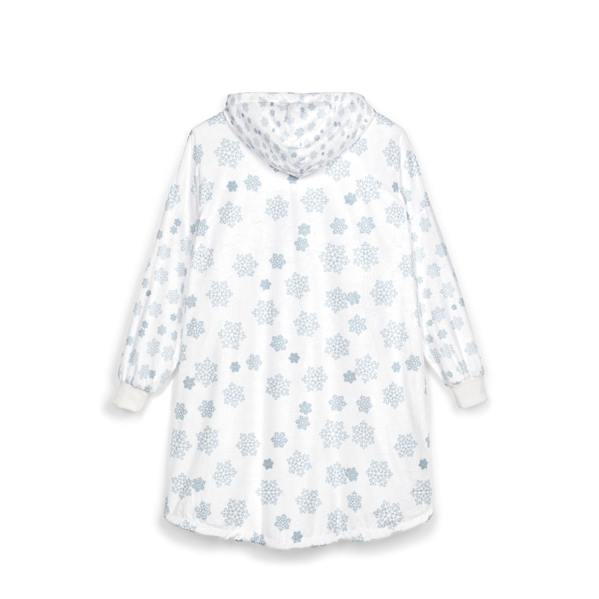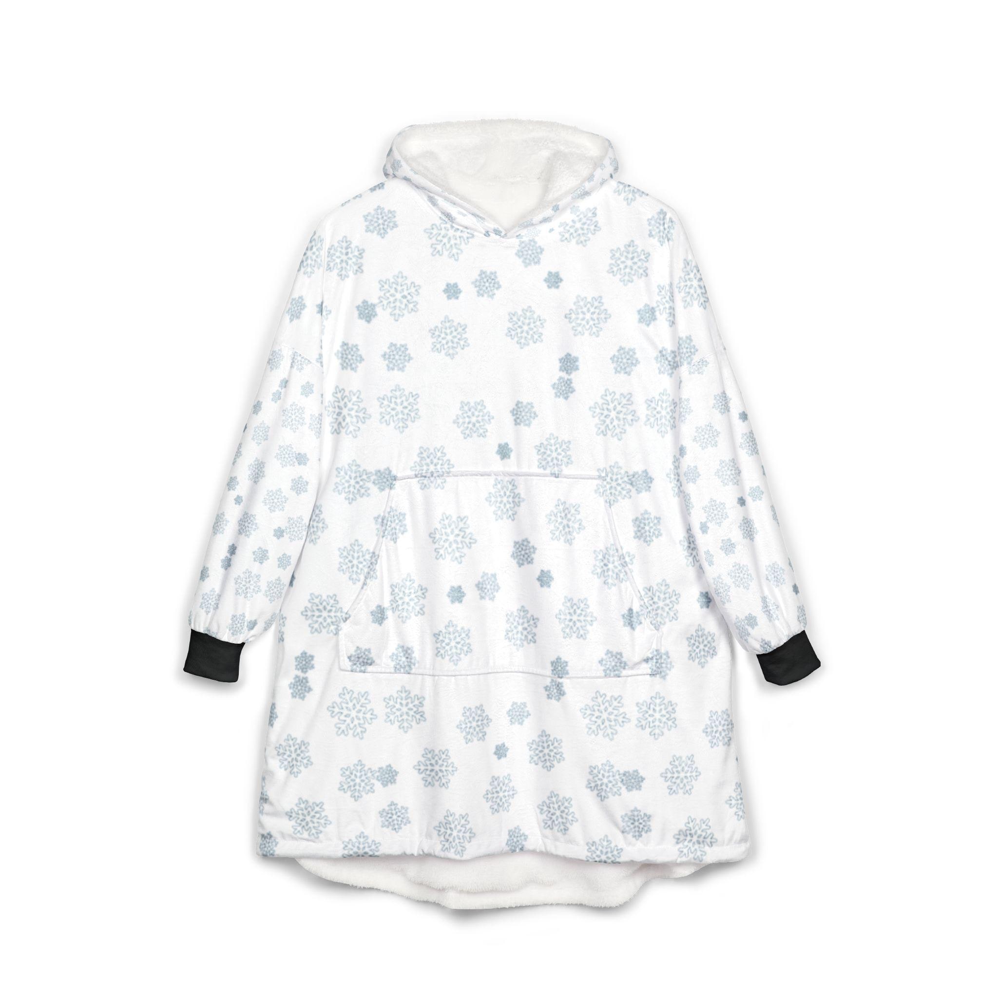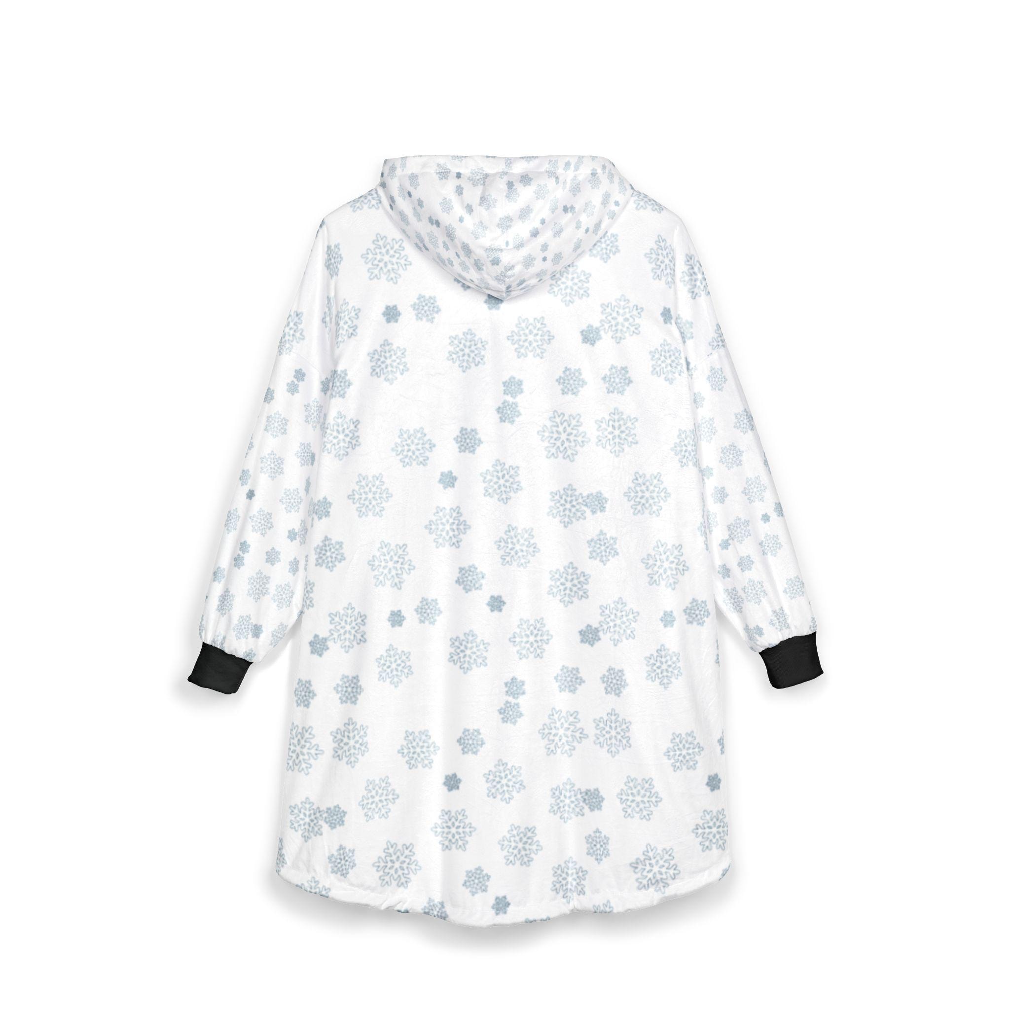 Wrap yourself in a gentle winter hush with this hooded blanket. Plush fleece and a soft sherpa-lined hood create a cozy retreat on chilly mornings and quiet evenings. The subtle icy-blue snowflake pattern feels calm and light, like a slow snowfall outside a cottage window. The oversized kangaroo pocket carries snacks, phone, or warming hands. Wear it while reading by lamplight, layering over pajamas for movie nights, or stepping onto a frosty porch with a steaming mug. This piece reads as comfort-first — soft against skin, easy to move in, and quietly seasonal without shouting for attention.