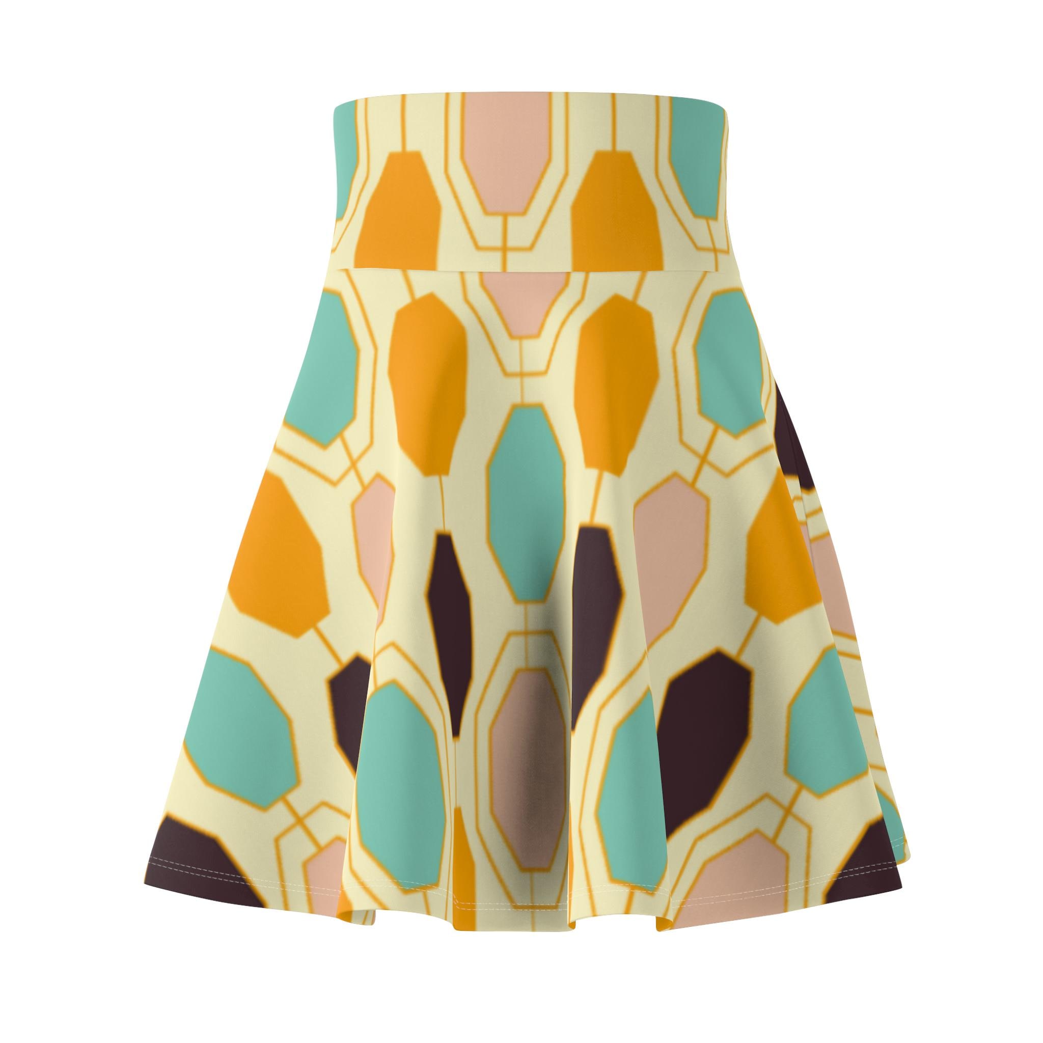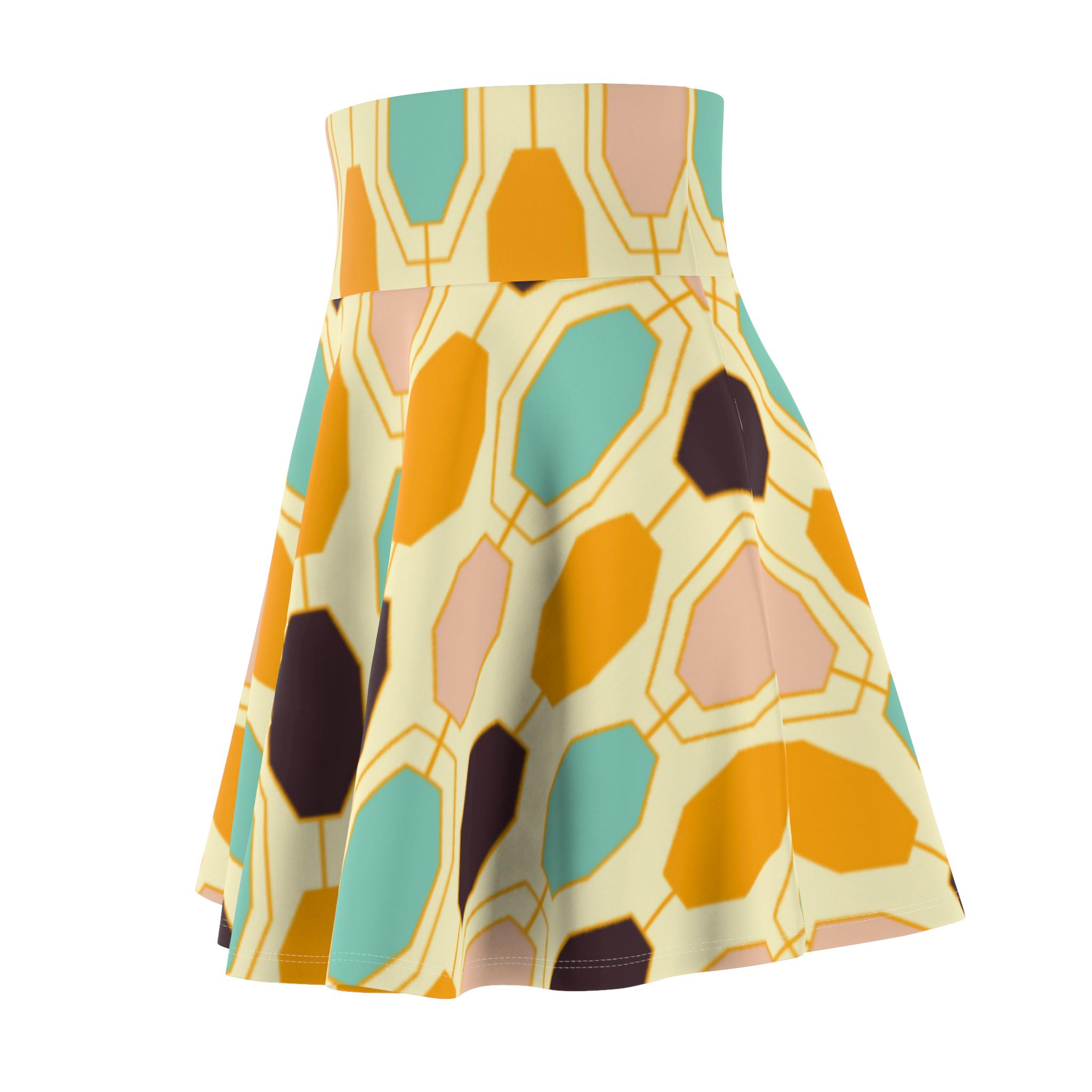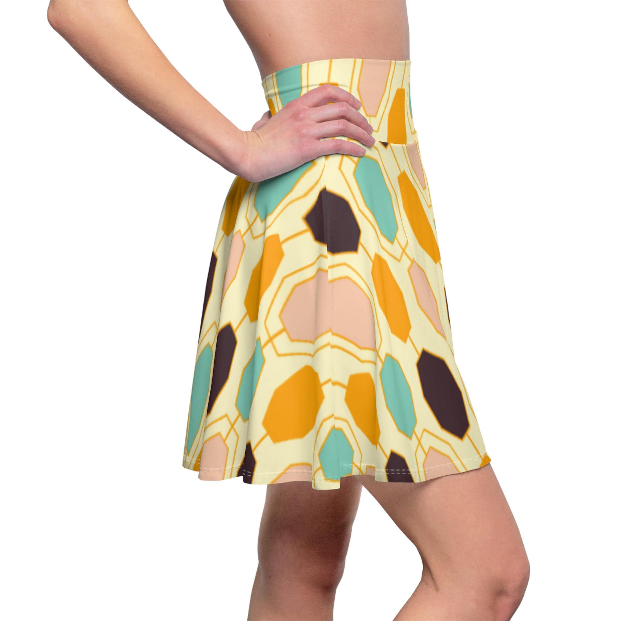 Light, lively, and made to move—this skater skirt brings sunlit retro tiles to your everyday wardrobe. The high-rise double waistband holds you in with soft support while the four-way stretch fabric follows every step and spin. Colors blend warm golds, seafoam teals, and soft neutrals into an abstract, painterly pattern that reads playful and artful. Wear it to wander markets, meet friends for coffee, or dance through a summer evening; the fit flatters while the fabric keeps its shape. Thoughtful construction (flatlock seams and a wide elastic waist) keeps comfort front and center so you can focus on living in the moment.