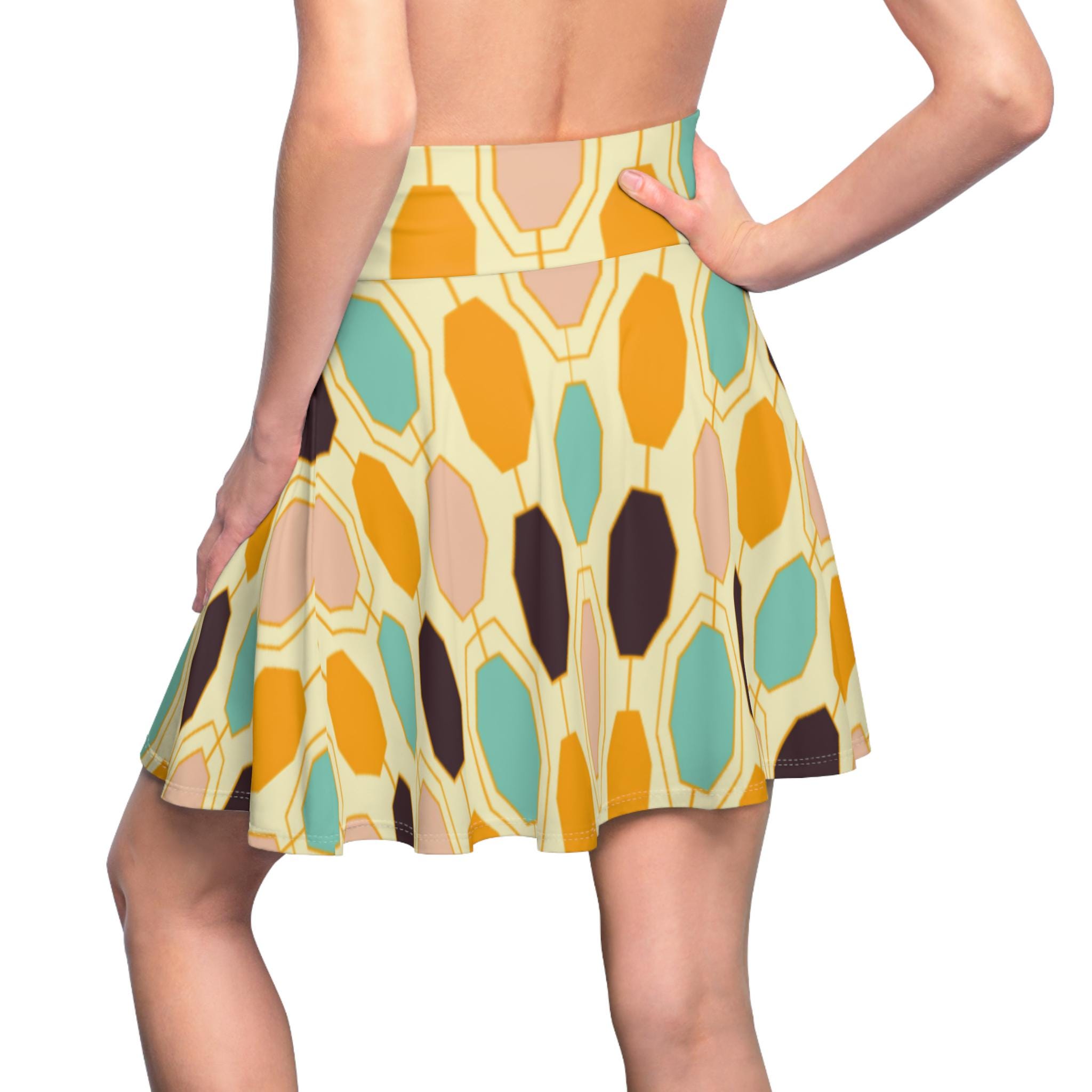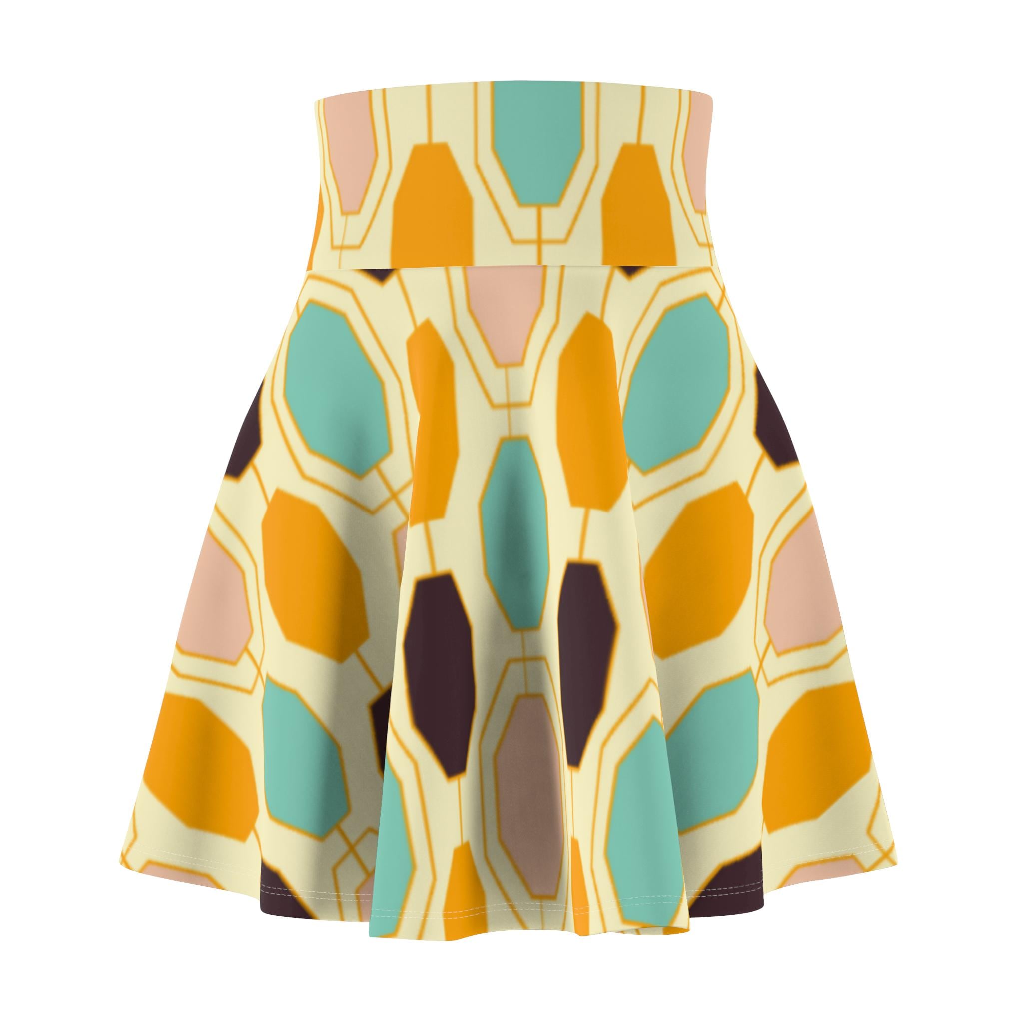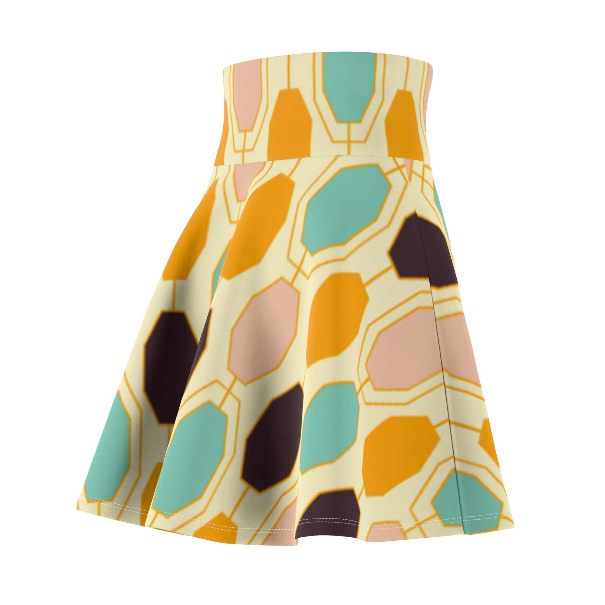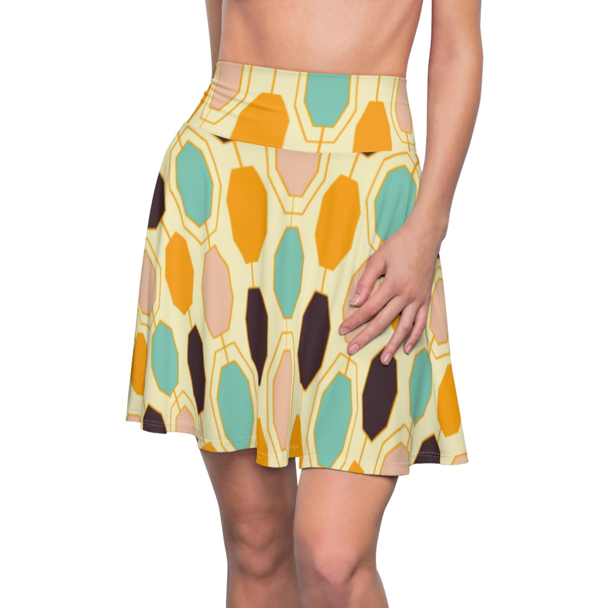 Light, lively, and made to move—this skater skirt brings sunlit retro tiles to your everyday wardrobe. The high-rise double waistband holds you in with soft support while the four-way stretch fabric follows every step and spin. Colors blend warm golds, seafoam teals, and soft neutrals into an abstract, painterly pattern that reads playful and artful. Wear it to wander markets, meet friends for coffee, or dance through a summer evening; the fit flatters while the fabric keeps its shape. Thoughtful construction (flatlock seams and a wide elastic waist) keeps comfort front and center so you can focus on living in the moment.