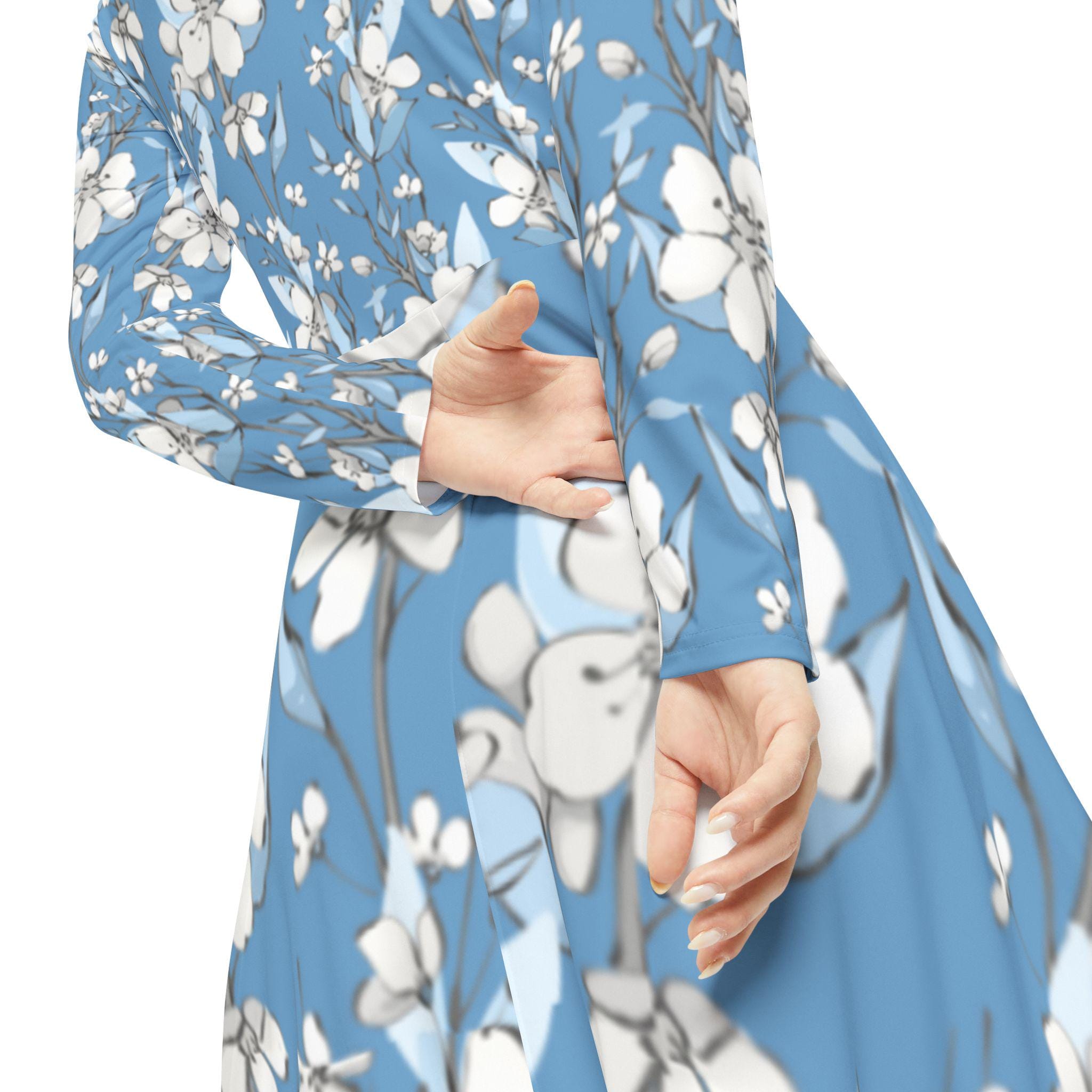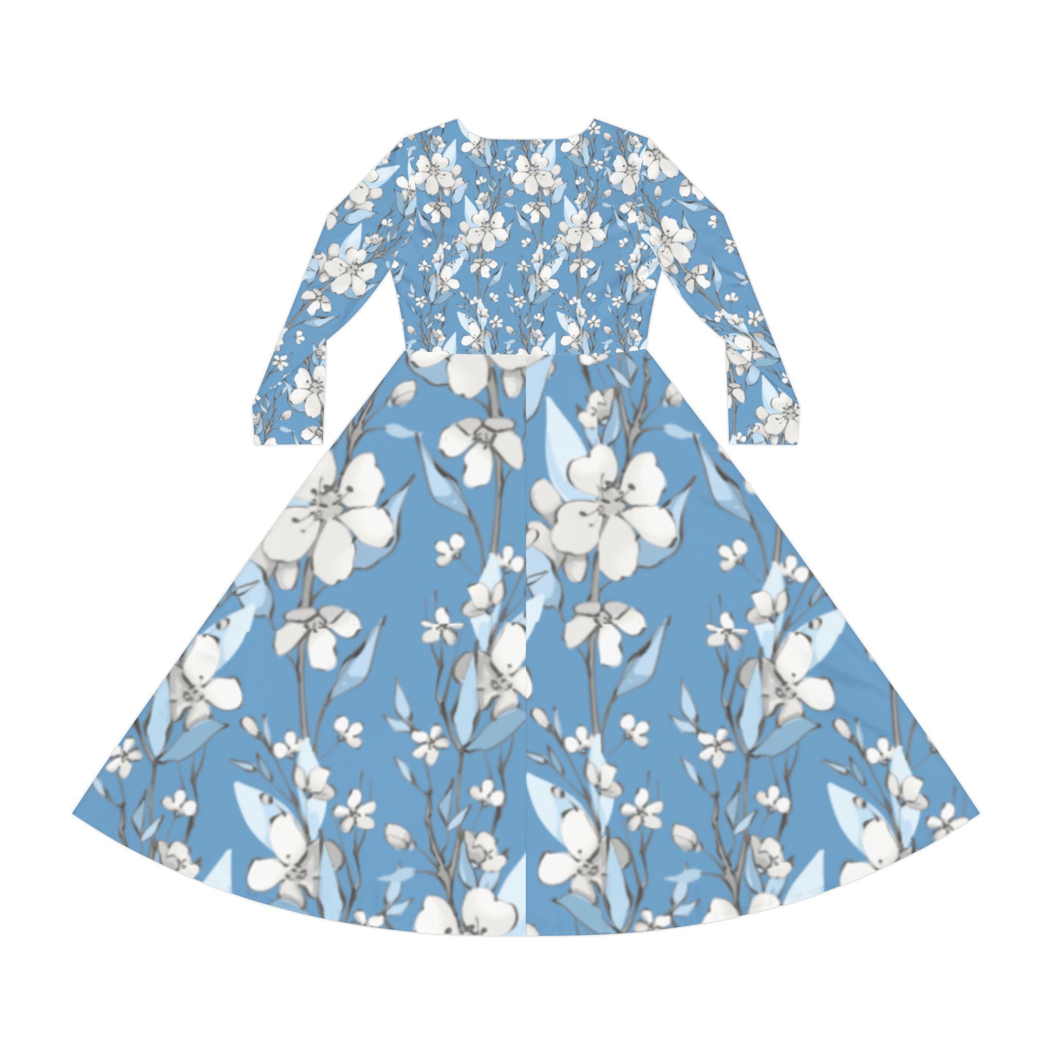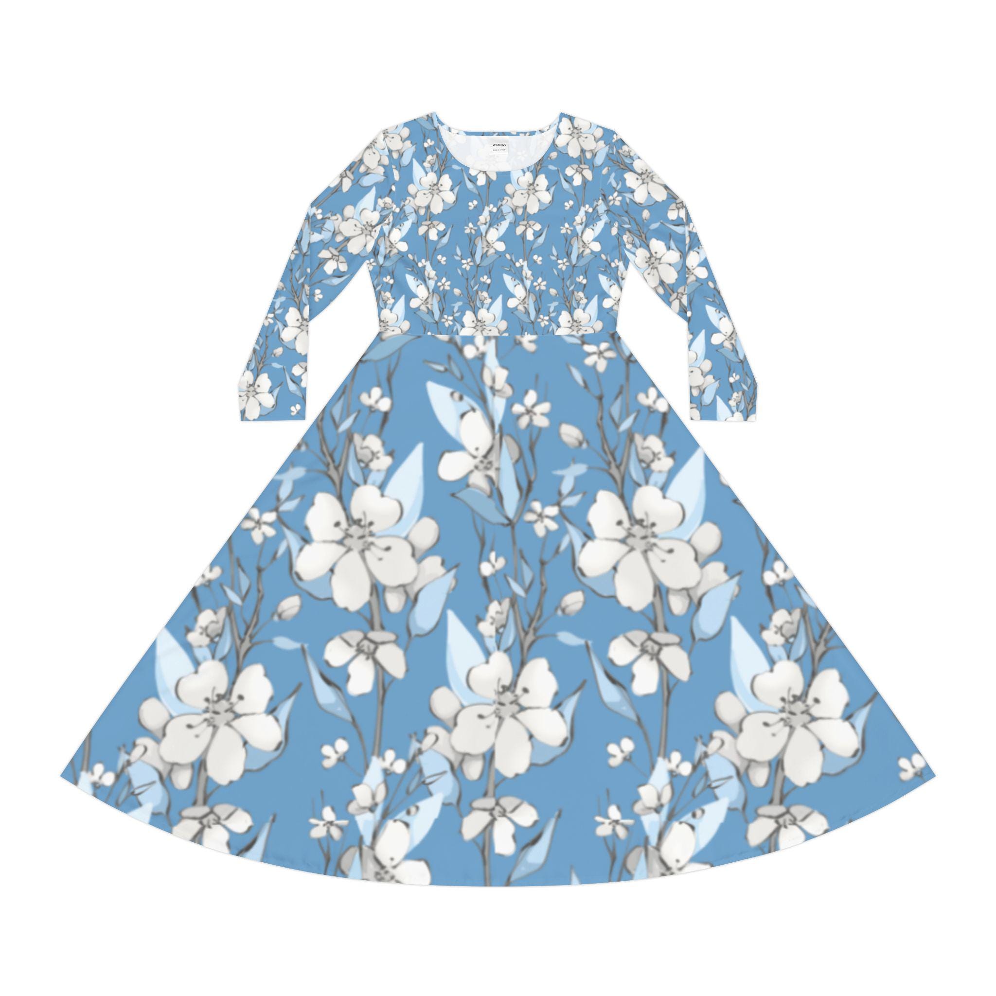 A soft, flowing long-sleeve dance dress printed all over with delicate white blossoms on a clear sky-blue background. The lightweight polyester holds vibrant color and movement, so the floral pattern stays bright as the skirt swirls. The high scoop neckline and regular fit create a graceful silhouette that lets arms and torso move freely during practice or an evening out. Wear it for recitals, springtime gatherings, or any moment you want to feel airy, confident, and quietly joyful.