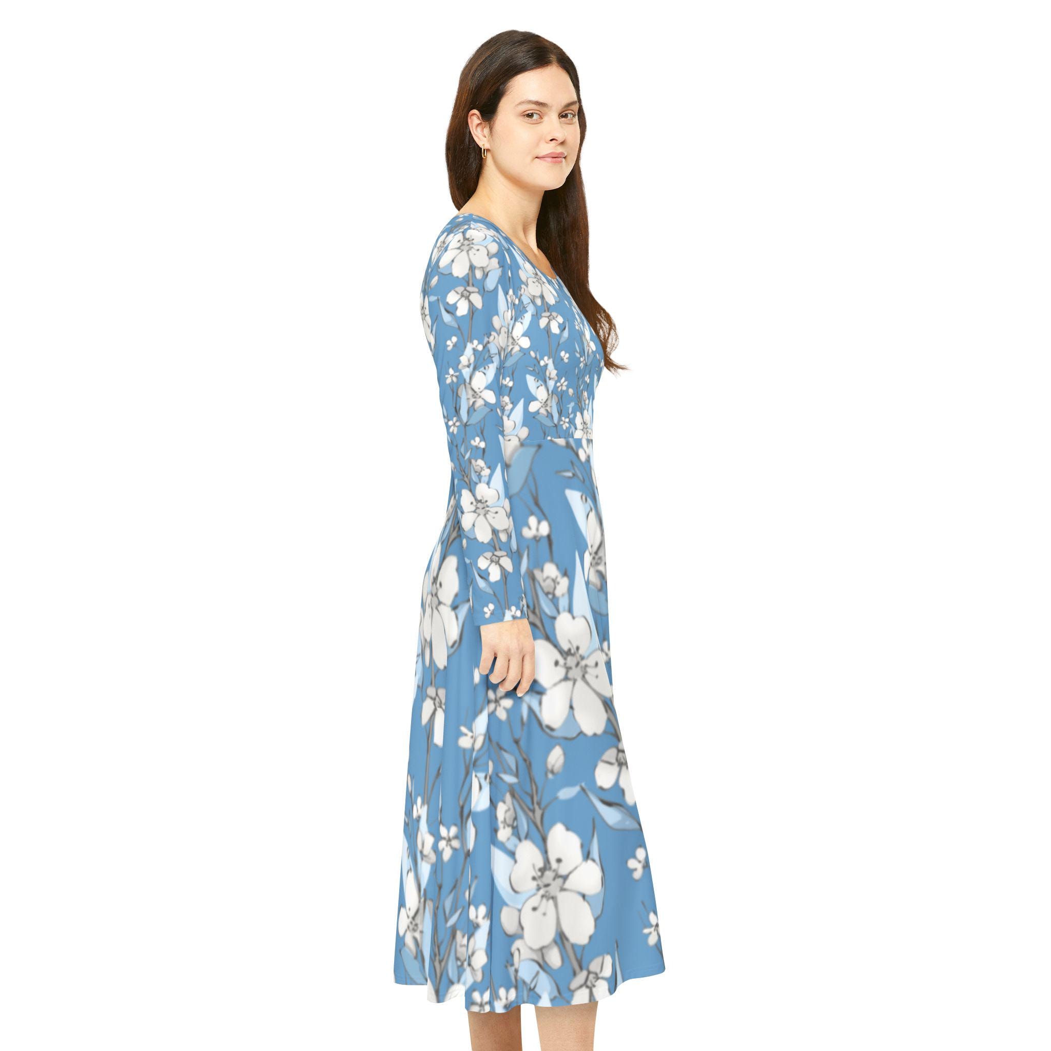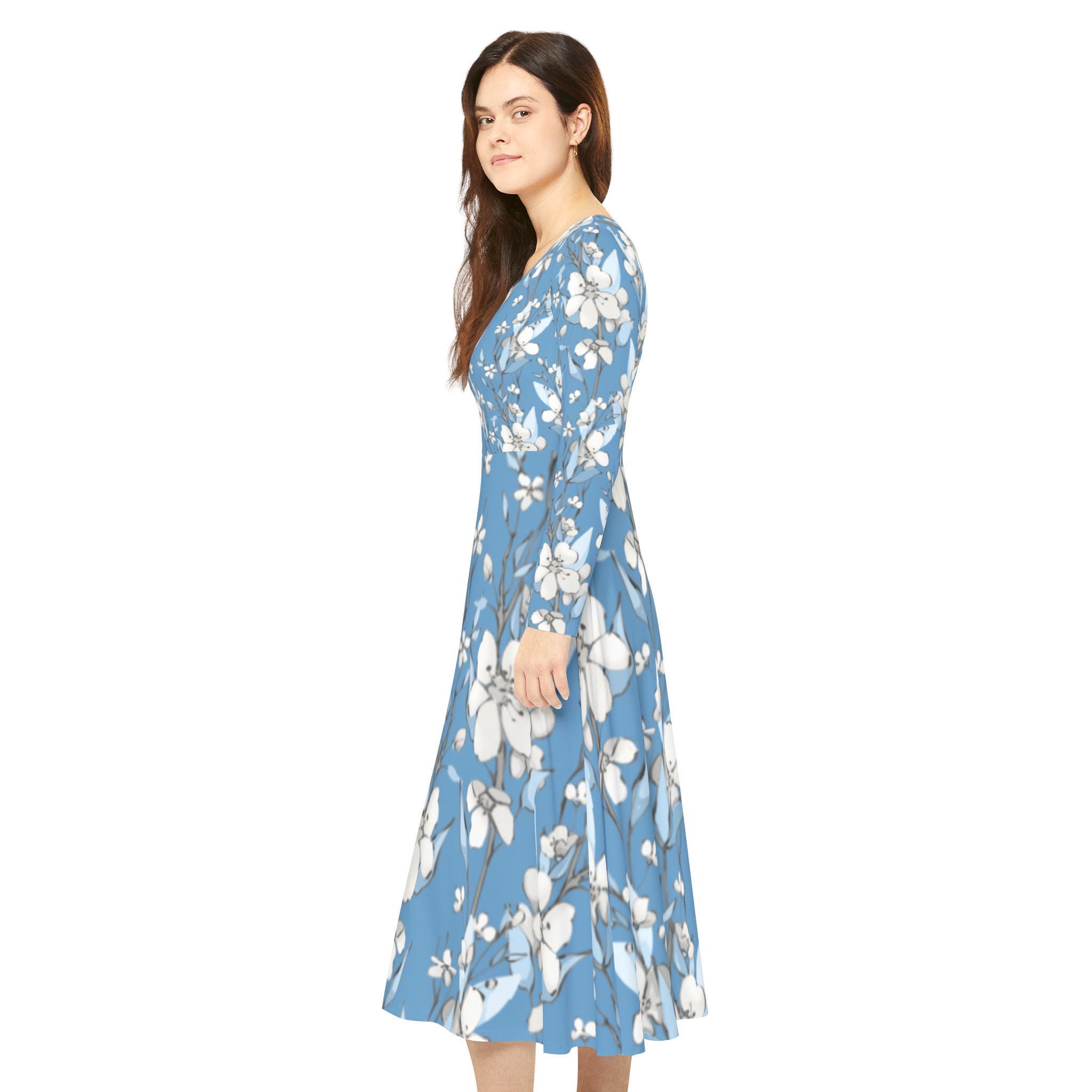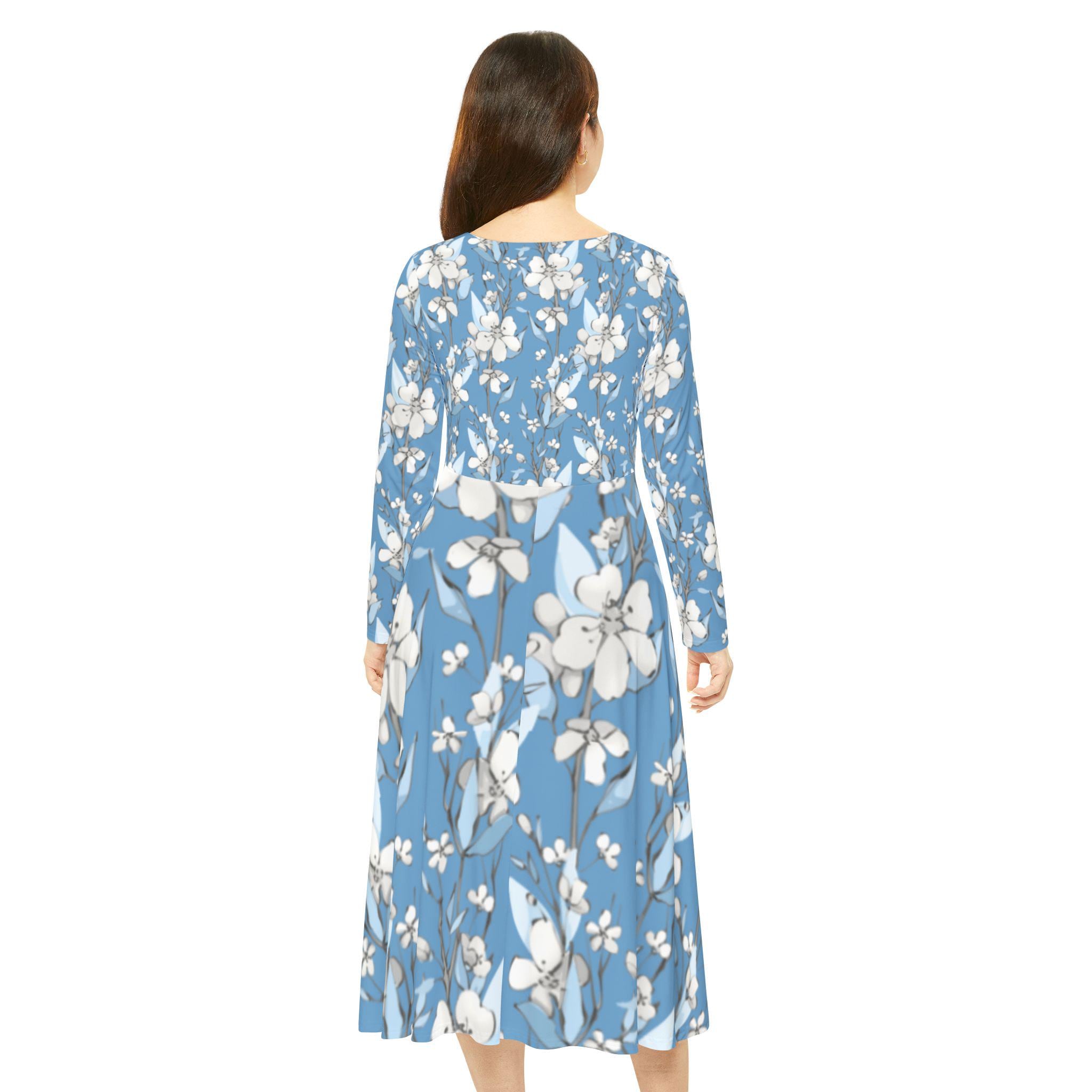 A soft, flowing long-sleeve dance dress printed all over with delicate white blossoms on a clear sky-blue background. The lightweight polyester holds vibrant color and movement, so the floral pattern stays bright as the skirt swirls. The high scoop neckline and regular fit create a graceful silhouette that lets arms and torso move freely during practice or an evening out. Wear it for recitals, springtime gatherings, or any moment you want to feel airy, confident, and quietly joyful.